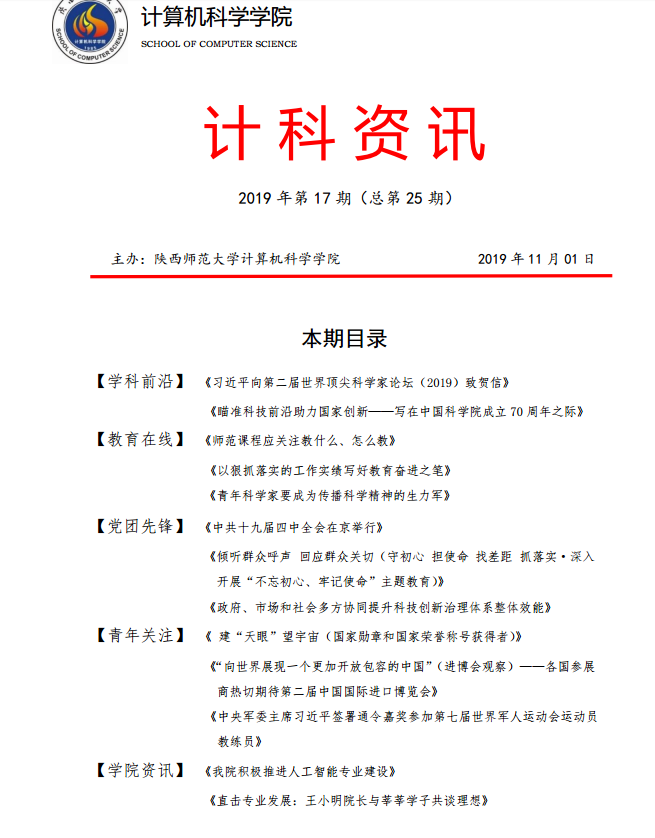 《计科资讯》是best365编辑整理的电子资讯,信息来源为《光明日报》《人民日报》《中国青年报》等权威纸媒,编辑工作由公司优秀本科生党员、团员承担。《计科资讯》主要包括学科前沿、教育在线、党团先锋、青年关注及公司资讯五个版块。公司师生可以从中了解到专业前沿和国家时政大事,欢迎大家下载阅读。