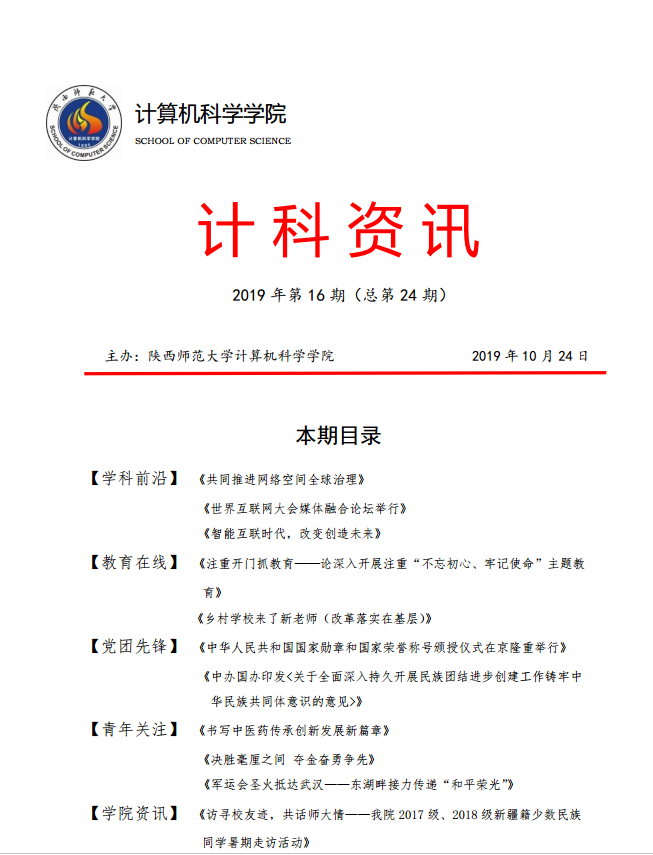 《计科资讯》是best365编辑整理的电子资讯,信息来源为《光明日报》《人民日报》《中国青年报》等权威纸媒,编辑工作由公司优秀本科生党员、团员承担。《计科资讯》主要包括学科前沿、教育在线、党团先锋、青年关注及公司资讯五个版块。公司师生可以从中了解到专业前沿和国家时政大事,欢迎大家下载阅读。