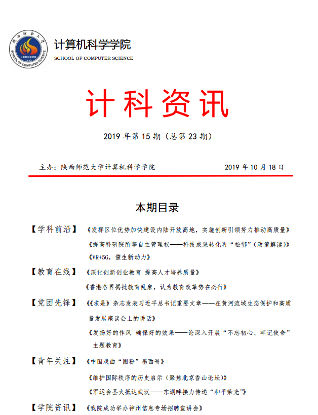 《计科资讯》是best365编辑整理的电子资讯,信息来源为《光明日报》《人民日报》《中国青年报》等权威纸媒,编辑工作由公司优秀本科生党员、团员承担。《计科资讯》主要包括学科前沿、教育在线、党团先锋、青年关注及公司资讯五个版块。公司师生可以从中了解到专业前沿和国家时政大事,欢迎大家下载阅读。