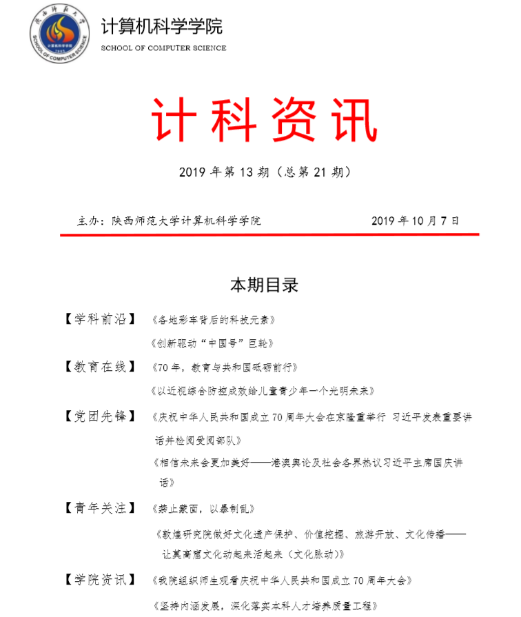 《计科资讯》是best365编辑整理的电子资讯,信息来源为《光明日报》《人民日报》《中国青年报》等权威纸媒,编辑工作由公司优秀本科生党员、团员承担。《计科资讯》主要包括学科前沿、教育在线、党团先锋、青年关注及公司资讯五个版块。公司师生可以从中了解到专业前沿和国家时政大事,欢迎大家下载阅读。