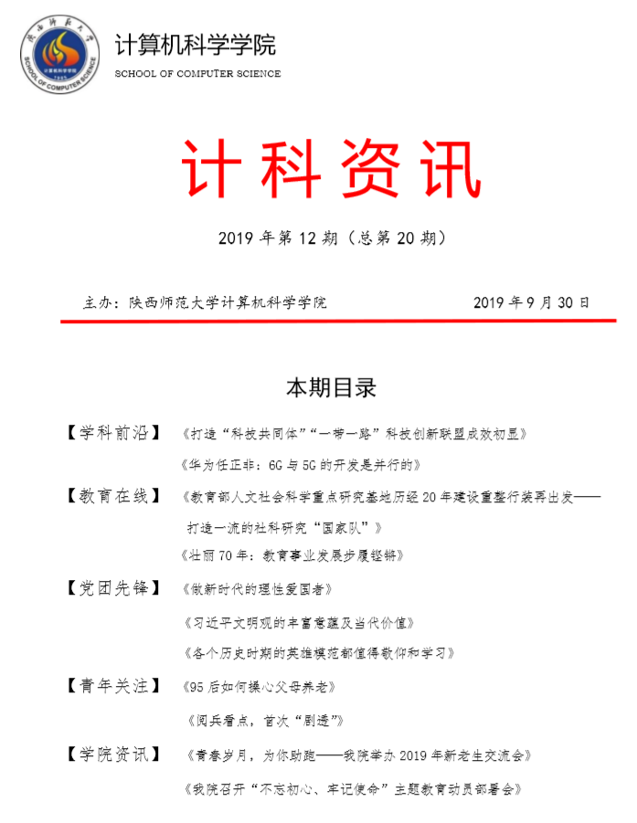 《计科资讯》是best365编辑整理的电子资讯,信息来源为《光明日报》《人民日报》《中国青年报》等权威纸媒,编辑工作由公司优秀本科生党员、团员承担。《计科资讯》主要包括学科前沿、教育在线、党团先锋、青年关注及公司资讯五个版块。公司师生可以从中了解到专业前沿和国家时政大事,欢迎大家下载阅读。