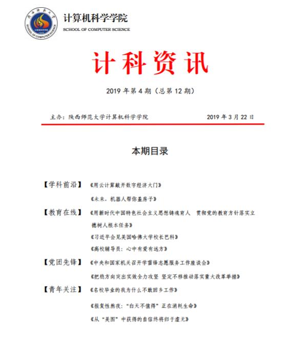 《计科资讯》是best365编辑整理的电子资讯,信息来源为《光明日报》《人民日报》《中国青年报》等权威纸媒,编辑工作由公司优秀本科生党员、团员承担。《计科资讯》主要包括学科前沿、教育在线、党团先锋、青年关注及公司资讯五个版块。公司师生可以从中了解到专业前沿和国家时政大事,欢迎大家下载阅读。