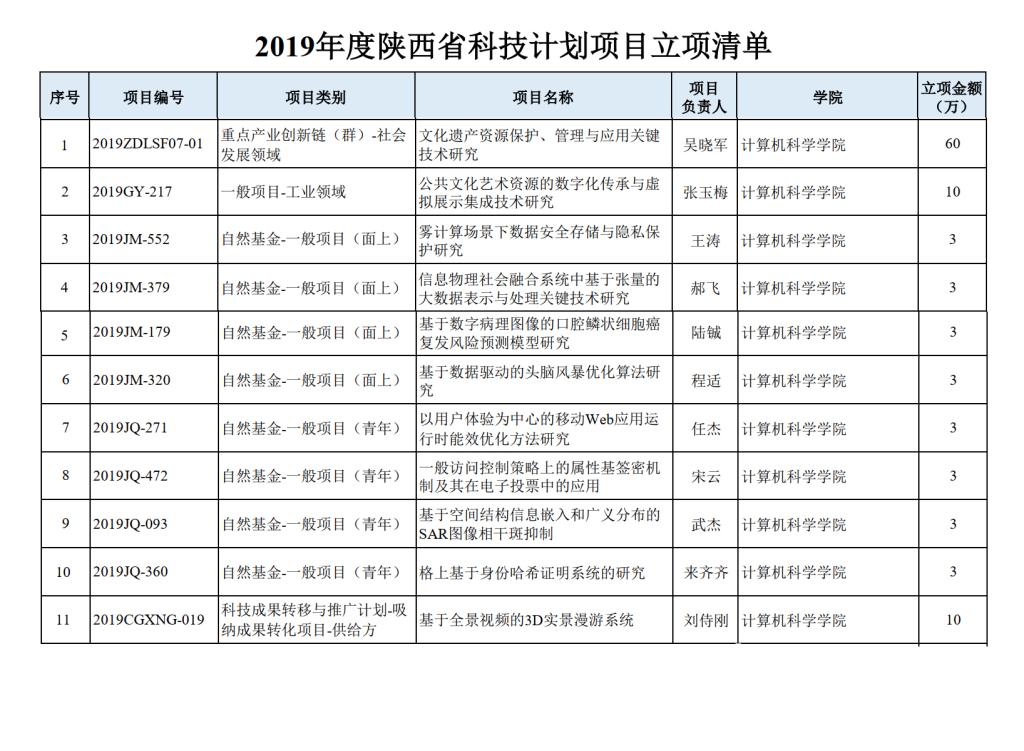 近日,陕西省科学技术厅公布了2019年陕西省科技计划项目资助结果,公司11项项目获得项目资助,其中,点产业创新链(群)项目1项,工业领域项目1项,自然科学基础研究计划项目-面上项目4项,自然科学基础研究计划项目-青年基金4项,科技成果转移与推广计划-吸纳成果转化项目1项,立项经费104万元,立项经费总数位居全校第三。