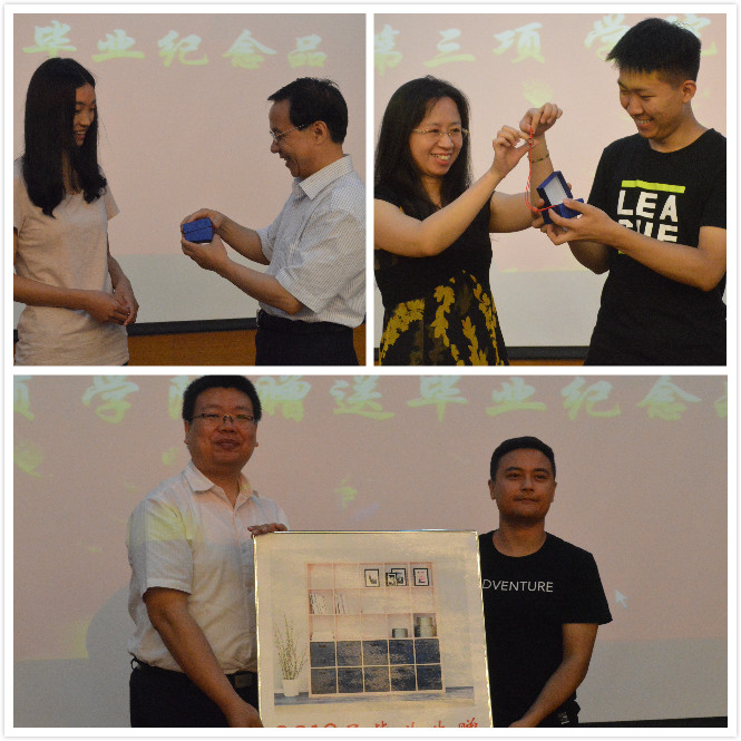 随后,公司和毕业生互送礼物。首先经理王小明和副经理马苗代表公司为毕业生代表赠送纪念品——定制纪念戒。纪念戒盒子上印着公司院徽和best365字样,纪念戒指外侧镌刻公司名称及院训“正行·明理·通道”,内侧刻有毕业生姓名和学号,每枚戒指独一无二。希望2018届毕业生能带着公司的殷切希望和真诚祝福,勇敢前行。随后,毕业生代表向公司赠送纪念品——书架。小小的书架承载着2018届毕业生对公司的真诚祝福,祝愿公司饱含书生气,桃李满天下。