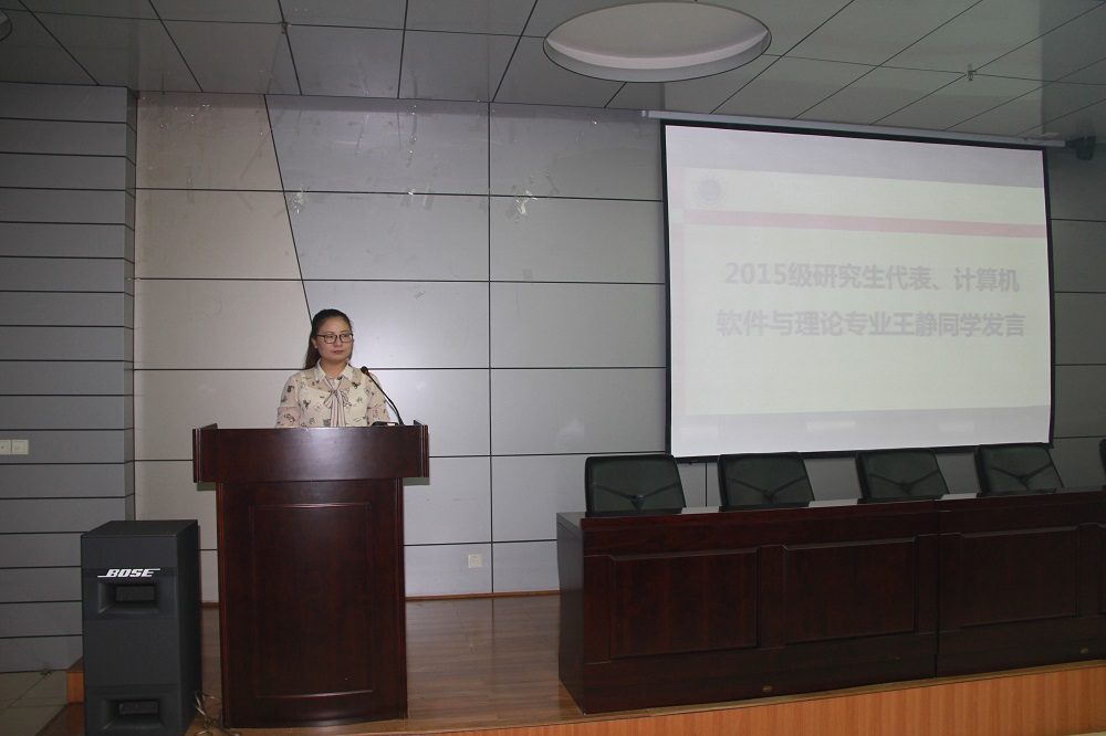 高年级员工代表、2015级计算机软件与理论专业研究生王静结合自身经历分享了自己对研究生生活的感想,并对新生提出“一个目标、两个热情、三个美好”的希望和祝愿,即对新生活建立新的目标,对科研和生活的热情,学术成果收获的美好、综合实力提高的美好、best365的未来充满美好。