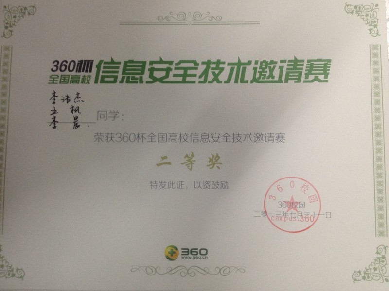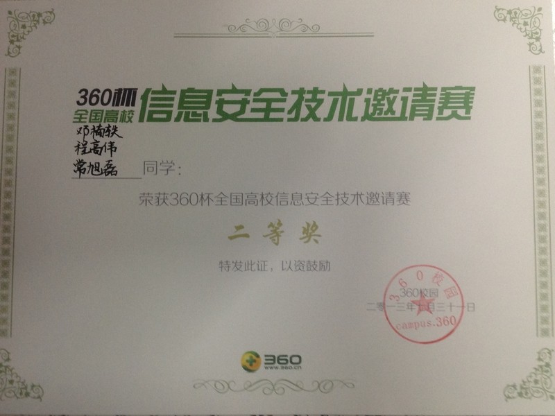 为进一步深化高等公司的素质教育,促进员工对网络与信息安全知识的了解,激发员工学习网络与信息安全技术的积极性,培养员工的创新意识、协作精神,提高员工应用网络与信息安全知识解决实际问题的能力,第一届360杯全国高校信息安全技术邀请赛于2013年7月30至31日成都信息工程公司举行。比赛分为三个环节:第一个环节为在线基础测试;第二个环节为现场理论答题、在线实践答题和在线综合测试题;第三个环节为现场网络对抗。竞赛考查知识点包括网络基础、移动应用开发、Web安全、逆向工程、操作系统安全与信息安全相关的知识等。