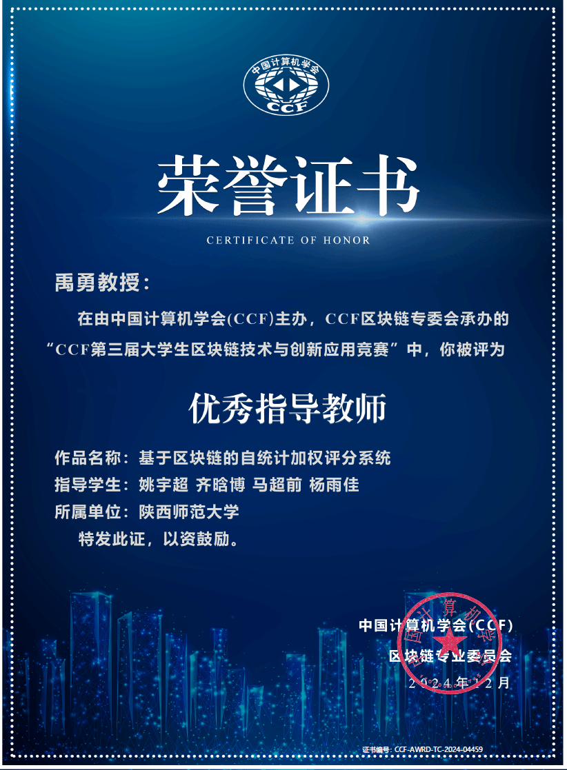 近日,中国计算机学会公布了“第三届CCF区块链技术与创新应用竞赛”决赛成绩。本次竞赛吸引了来自全国各大高校和企业的260支团队参与,经过激烈角逐,由公司禹勇教授指导,姚宇超、齐晗博、马超前、杨雨佳组成的团队,凭借其创新作品“基于区块链的自统计加权评分系统”成功晋级决赛。在决赛的现场答辩、作品展示及专家评审环节中,团队成员凭借扎实的专业知识、创新的技术方案以及出色的团队协作能力,赢得了评委的一致好评,最终荣获二等奖,禹勇教授被评为优秀指导教师。