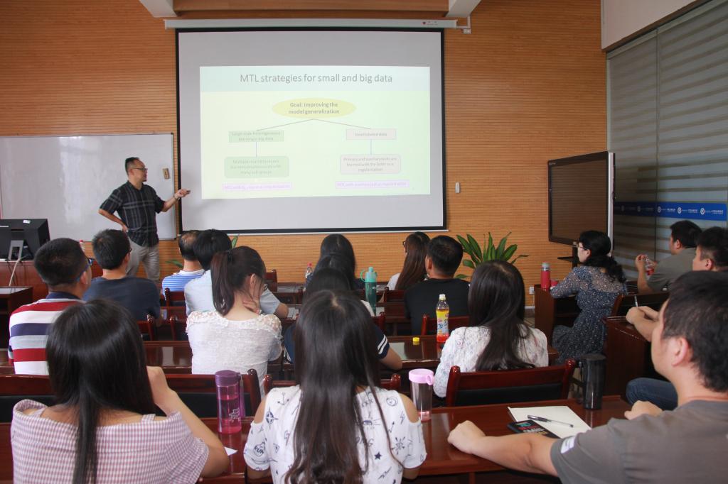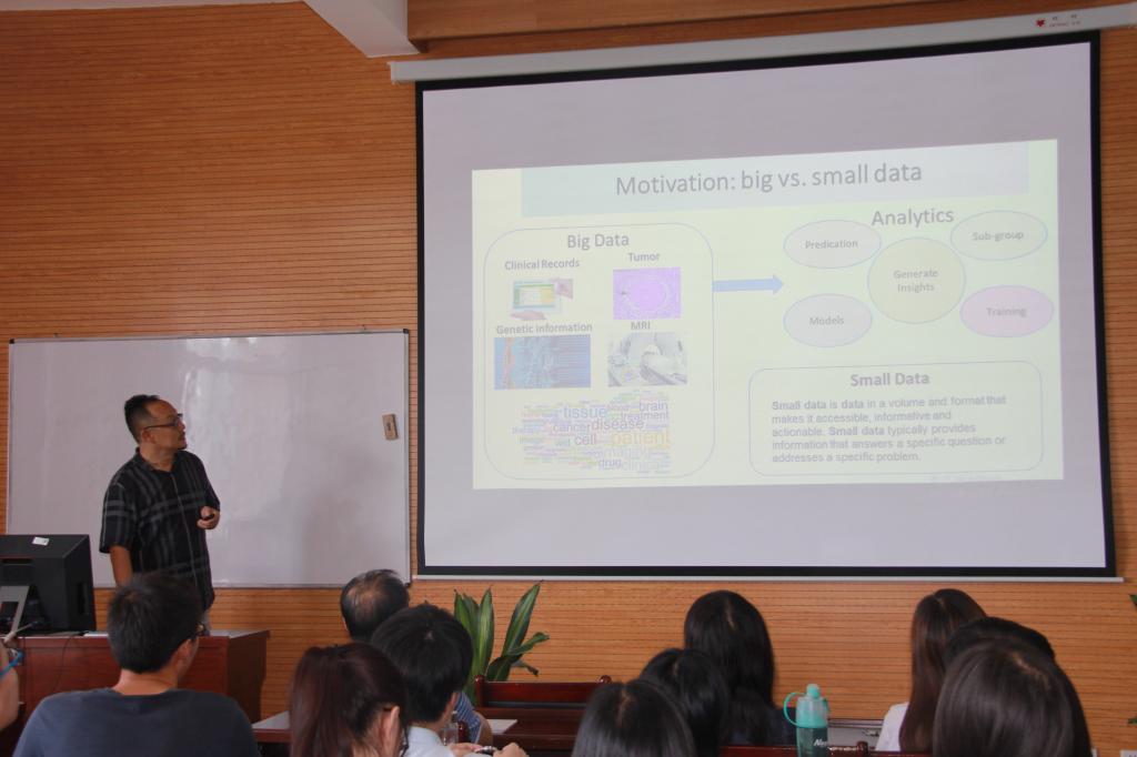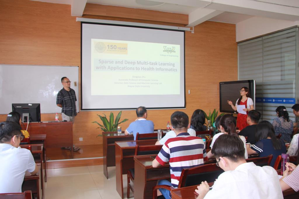 2018年6月28日,美国韦恩州立大学知名教授朱冬宵老师在公司文津楼三段628报告厅做了题目为《Sparse and Deep Multi-Task Learning with Applications to Health Informatics》的讲座。本次讲座由公司副经理雷秀娟教授主持,公司相关教师、研究生聆听了本次报告会。报告前,雷经理发表了热情洋溢的欢迎辞,向大家介绍了朱冬宵教授的基本信息和成就。