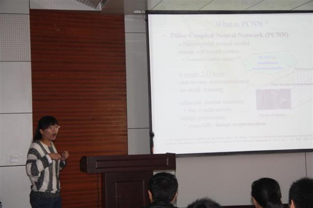 论坛一开始由刘汉强博士作了题为《多层图划分方法及其应用研究》的报告,从对聚类分析的介绍引出了图划分理论,并进一步介绍了基于局部相似性测度的SAR图像多层分割方法和免疫克隆图划分方法;接着陈昱莅博士作了题为《参数自动设置的SPCNN模型及其在图像分割和目标识别中的应用》的报告,介绍了SPCNN神经网络模型的参数自动设定方法,以及这个模型在图像分割和目标识别上的应用。最后两位博士和老师同学们对所提出的问题进行了讨论。