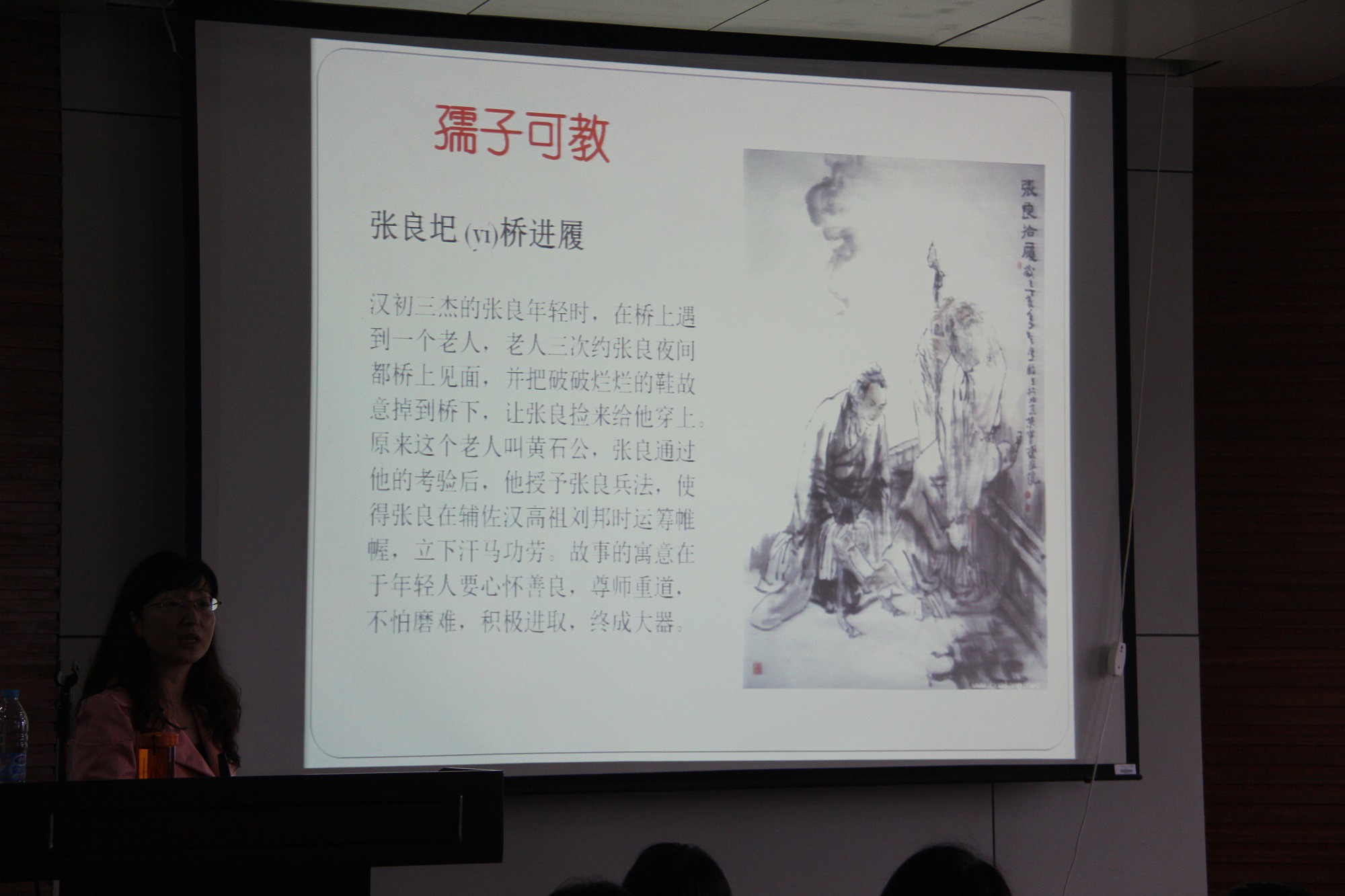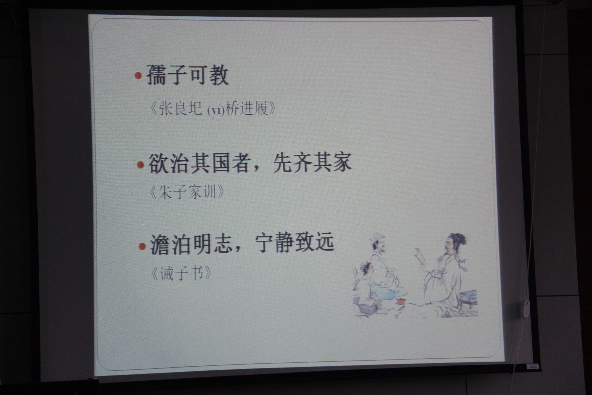 雷教授讲到“孺子可教”时引用《张良圯桥进屐》的典故,“欲治其国者,先齐其家”部分引用《朱子家训》,“淡泊明志,宁静致远”以《诫子书》开始,以古文为模板,再结合生活中实际存在的例子向同学们传递了一个个做人、做事、做学问的道理。
