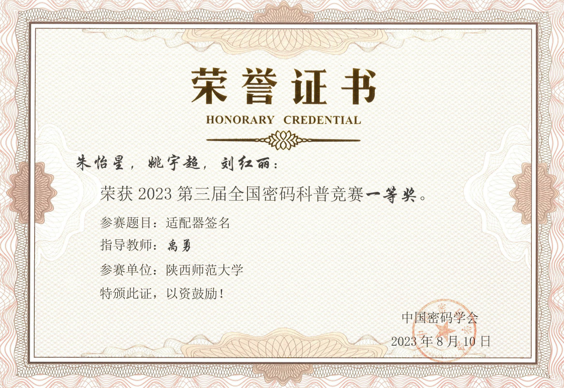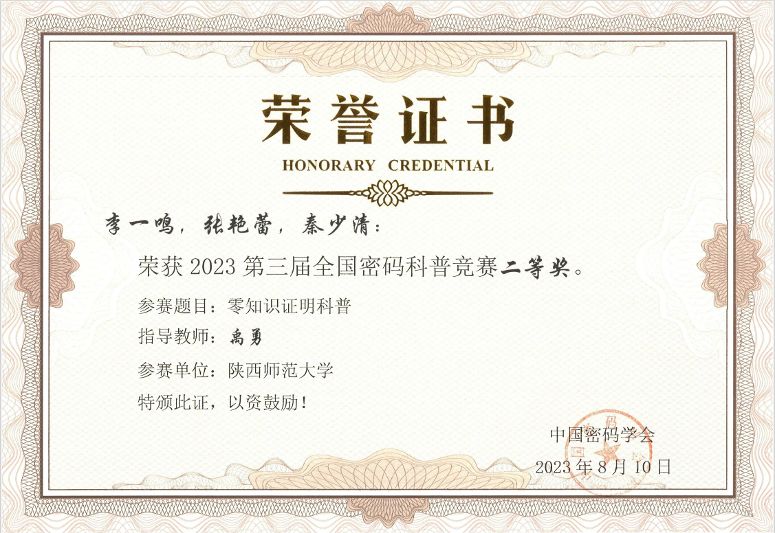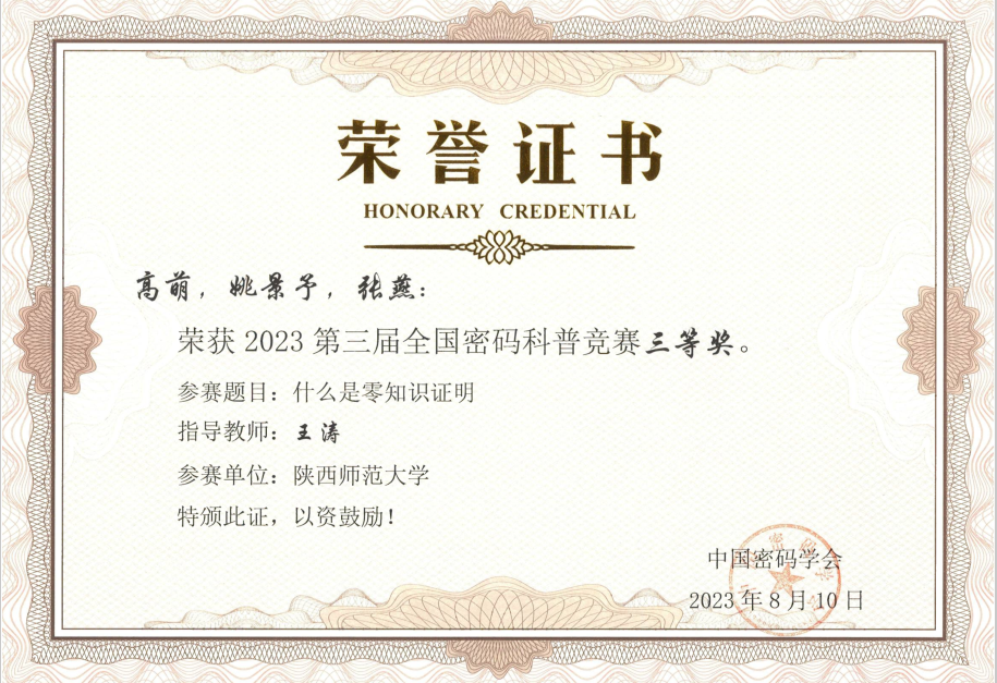 此次大赛共有来自全国各大高校、企业和科研院所的67个单位、280件作品参加比赛,经过激烈角逐,2支队伍获得一等奖,21支队伍获得二等奖,64支队伍获得三等奖。公司禹勇教授指导的两支参赛队伍在这一全国赛事中取得了出色成绩,作品《适配器签名》荣获一等奖, 队员为朱怡星、姚宇超、刘红丽;作品《零知识证明》荣获二等奖,队员为李一鸣、秦少清、张艳蕾。公司王涛副教授指导的队伍也表现优异,作品《什么是零知识证明》荣获三等奖,队员为高萌、姚景予、张燕。中国科公司院士、中国密码学会理事长王小云教授和国家密码管理局副局长何良生先生为获得一等奖的参赛队伍颁发了证书。