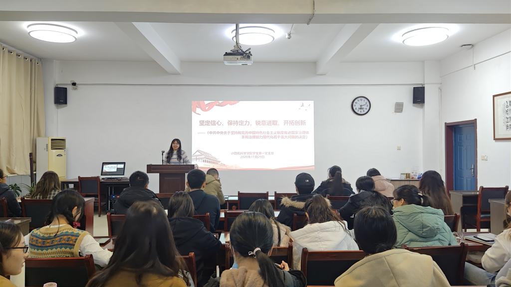 为深入学习坚持和完善中国特色社会主义制度、推进国家治理体系和治理能力现代化等问题,进一步探讨实现“两个一百年”奋斗目标、实现中华民族伟大复兴的中国梦的奋斗途径,公司员工第一党支部于11月29日晚18:15在文津楼3412报告厅举行了“坚定信心,保持定力,锐意进取,开拓创新”主题学习活动,活动由支部纪检委员张静妍同志主持。