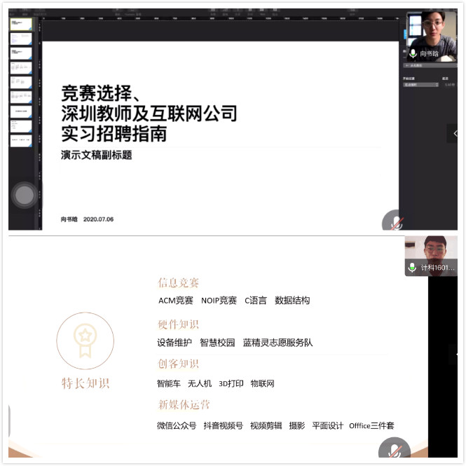 会议开始,袁冰就本次分享会的目的和内容进行了说明,指出过去在师范生中间存在的问题,提出了对同学们的期许。随后,安琪为同学们介绍了本次会议上进行经验分享的毕业生代表,分别是来自2016级计算机科学与技术专业的隋丰隆、冯苗苗、何向前和向书晗。4位同学各有侧重,分别从专业学习、干部服务、员工活动、科研竞赛等方面介绍了自己的经历经验。