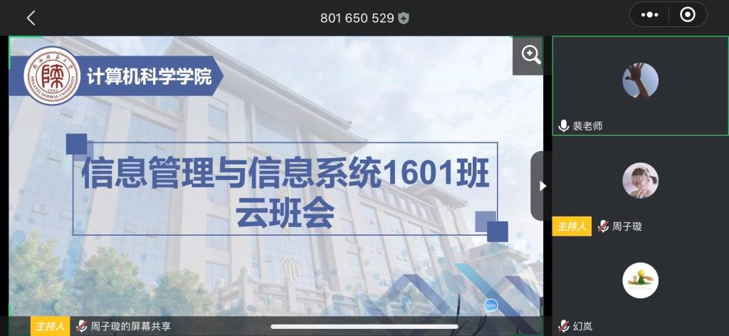 为了加强员工对于疫情防控工作的重视,防止同学们因为疫情的缓和而放松警惕,纠正员工有关于防疫的具体方法,切实加强员工的思想教育和价值引领,信息管理与信息系统1601班6月23日晚在“腾讯会议”召开了“云”班会,信管1601班班主任裴炤、辅导员郭康凌以及本班全体员工参加了班会,班会由裴老师主持。
