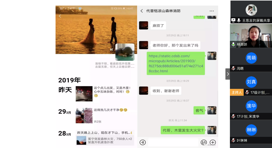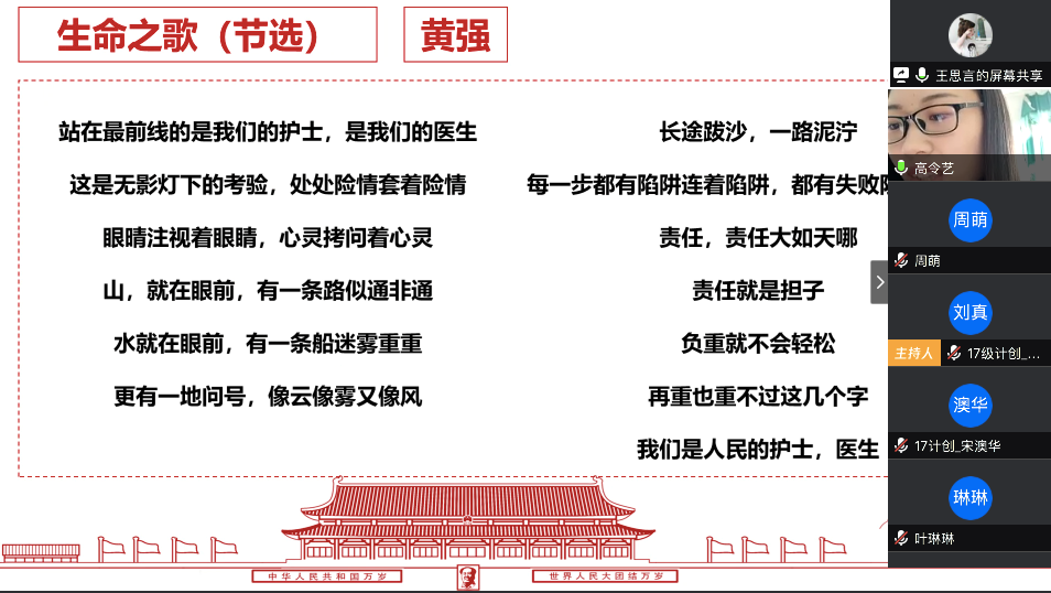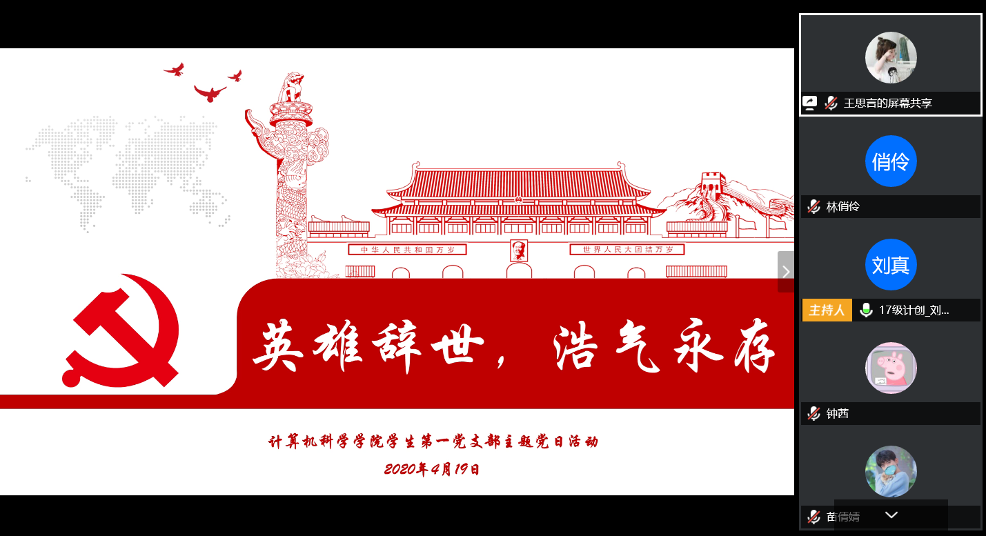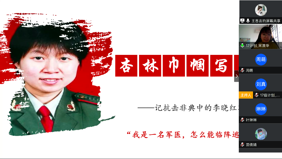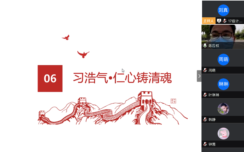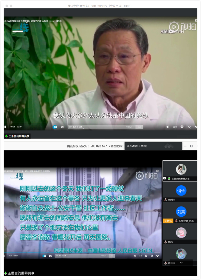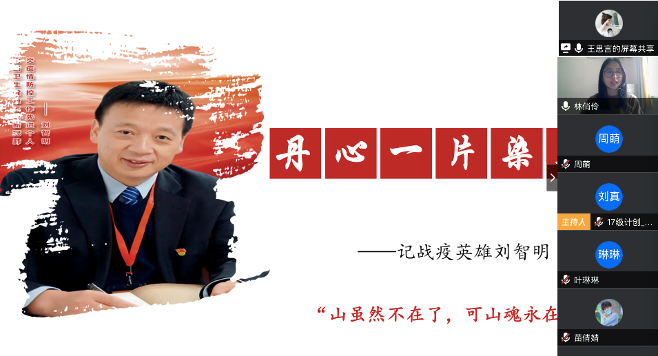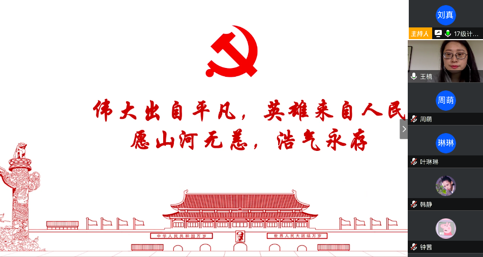 在最后的总结发言中,陈应权老师谈到,要珍惜别人付出辛苦劳动甚至是生命为我们创造的美好生活和疫情防控良好局面,要用自己的实际行动去捍卫来之不易的成果;要时刻铭记包括这次疫情的重大事件中为大家舍小家的平凡英雄们,不忘来路、始知归处;要透过我们所遇见的每一次灾难去反思,反思我们的言行举止是否符合我们的党员身份。王楠老师首先向同志简单地介绍了自己自疫情以来在公司疫情防控工作指挥部的工作。她表示,从国家层面来看,这次疫情大考彰显了社会主义制度的优越性,体现了人类命运共同体这一观点的正确性,是一场生动的爱国主义教育;从社会层面来看,尽管存在极少部分不和谐声音,但绝大多数中国人都主动担起社会责任,相信科学、相信权威,不信谣、不传谣;从个人层面来看,无论是奔赴一线还是居家抗疫,都是在为我国疫情防控工作贡献自己的力量。最后,她希望同学们在家学习生活之余,不忘积极参加劳动,锻炼身体,以最好的身体和心态迎接生活中的每一天。