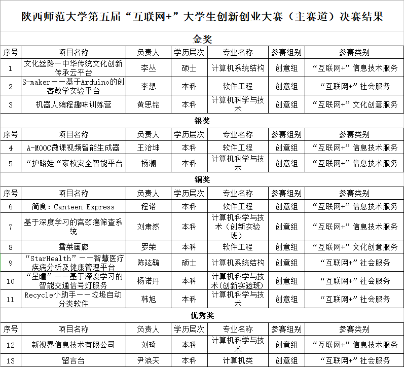 今年的第五届中国“互联网+”老员工创新创业大赛自4月启动以来,公司领导高度重视,在教师、员工两个层面积极动员,邀请优秀指导教师、相关领域专家为同学们答疑解惑,鼓励同学们跨年级、跨学科组建队伍,积极为同学们创造有利条件。最后公司在“互联网+”主赛道中共报名项目30项,经过专家线上评审,全校共有80个项目入围校级决赛,其中公司入围14个项目,占比17.5%,入围项目数量在全校二十余教学单位中名列第一。经过6月16日现场路演,由公司吴晓军老师、张玉梅老师指导,18级硕士研究生李丛所负责的“文化丝路—中华传统文化创新传承云平台”,由公司吴振强老师指导,16级本科生李想所负责的“S-maker—基于Arduino的创客教学实验平台”,由物理公司李佳伟老师、西安慧豚信息科技常志东老师指导,17本科生黄思铭所负责的“机器人编程趣味训练营”等3个项目分别获得校级决赛金奖;由公司吴振强老师、刘博老师所指导,16级本科生王治坤所负责的“A-MOOC微课视频智能生成器”,由公司毛庆老师、陈应权老师所指导,17级本科生杨澜所负责的“‘护路娃’家校安全智能平台”等2个项目分别获得校级决赛银奖;另有6个项目获得校级决赛铜奖,2个项目获得校级决赛优秀奖。其中,公司3个金奖项目与2个银奖项目共5支队伍被公司推荐参加第五届中国“互联网+”老员工创新创业大赛陕西省省级复赛,在公司推荐的18支队伍中,占比27.8%,数量同样在全校各单位中名列第一。