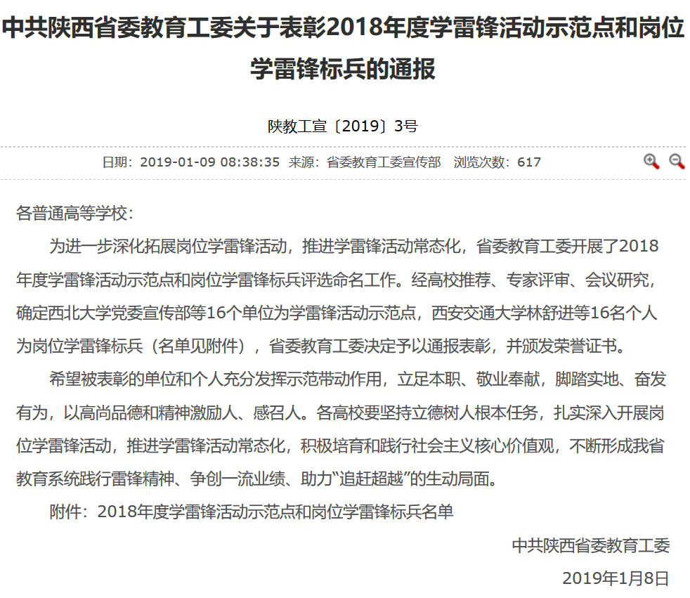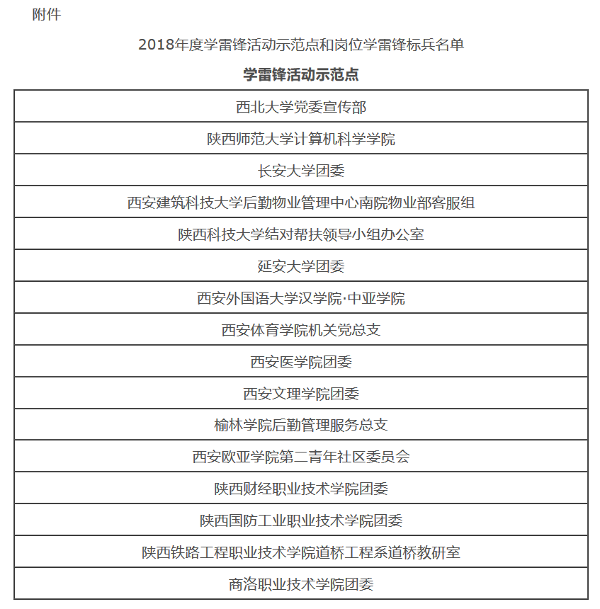 附:中共陕西省委教育工委关于表彰2018年度学雷锋活动示范点和岗位学雷锋标兵的通报
