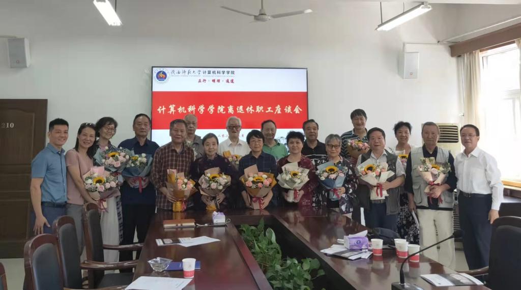 王耀明代表公司衷心祝愿各位离退休教职工节日快乐,身体康泰,诚请老一辈领导老师继续关心关注公司发展,积极参与各项工作,传承“西部红烛精神”,讲好计科故事。最后,公司领导班子成员向各位离退休教职工代表送上鲜花和祝福,合影留念。