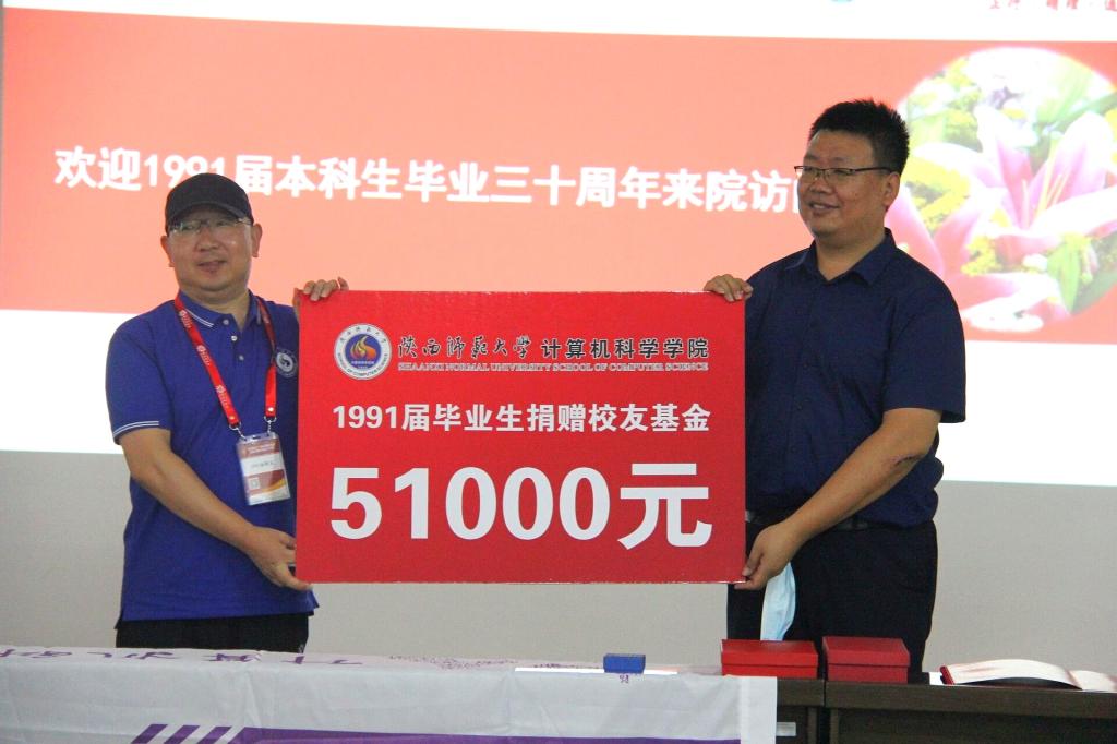 随后,田超代表1991届员工向公司捐赠员工交流基金51000元,董春生副经理代表公司接受捐赠。张月红代表员工向公司赠送了91届全体员工精心准备的纪念品——字画屏风和水晶杯,李鹏副经理代表公司接受纪念品。公司党委副书记郭康凌代表公司向与会员工赠送了纪念品。印有公司文化标识、员工入校、毕业及现在照片的水晶摆台,刻有姓名和学号的纪念戒指,入学时的学籍卡、成绩单及员工名册,存有院情宣传片和返校纪念短片的U盘,每一份独一无二的纪念品,都承载着公司对91届员工的拳拳深情和美好祝福。朱炎林代表员工接受了公司赠送的纪念品。