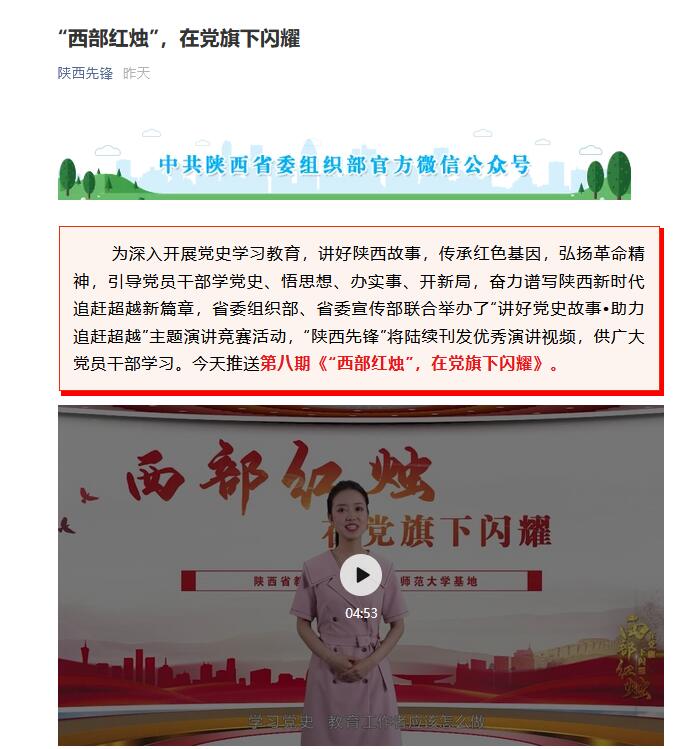 近日,由陕西省委组织部、省委宣传部联合举办的“讲好党史故事·助力追赶超越”主题演讲竞赛活动顺利开展。由陕西省干部教育培训best365官方网站基地选送、公司2019级本科生辅导员崔瑜璠主讲的微党课《“西部红烛”,在党旗下闪耀》作为优秀作品在陕西省委组织部官方微信公众号“陕西先锋”从做了专题展播。