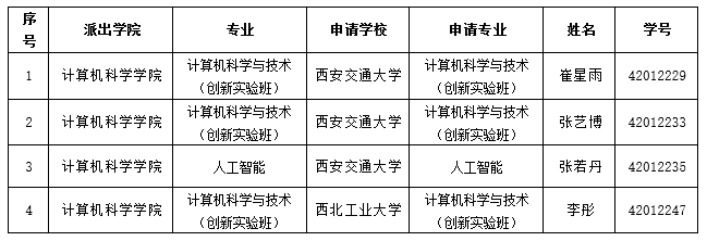 根据教务处《关于遴选赴西安交通大学等四所高校国内交换生的通知》要求,公司对申请赴赴西安交通大学等四所高校国内交换生的同学进行了遴选,现将结果公示如下: