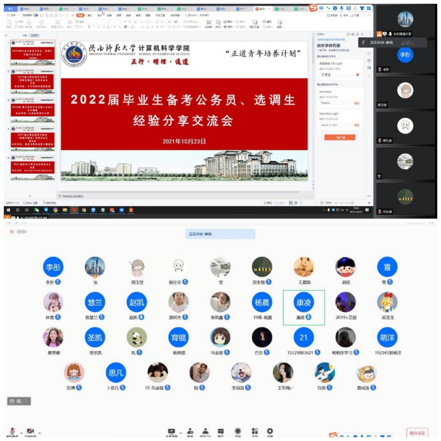 为进一步促进公司2022届毕业生对公务员、选调生政策的了解,帮助同学们做好备考、就业相关准备,10月23日晚,我院通过腾讯会议形式举办“正道青年培养计划”之2022届毕业生备考公务员、选调生经验分享交流会。公司4位考取了公务员、选调生的优秀员工分享备考经验,毕业班辅导员田海东、2022届意向公考的本科生、研究生,公司其他低年级有意向了解公考相关情况的同学参加会议。会议由公司党委副书记郭康凌主持。