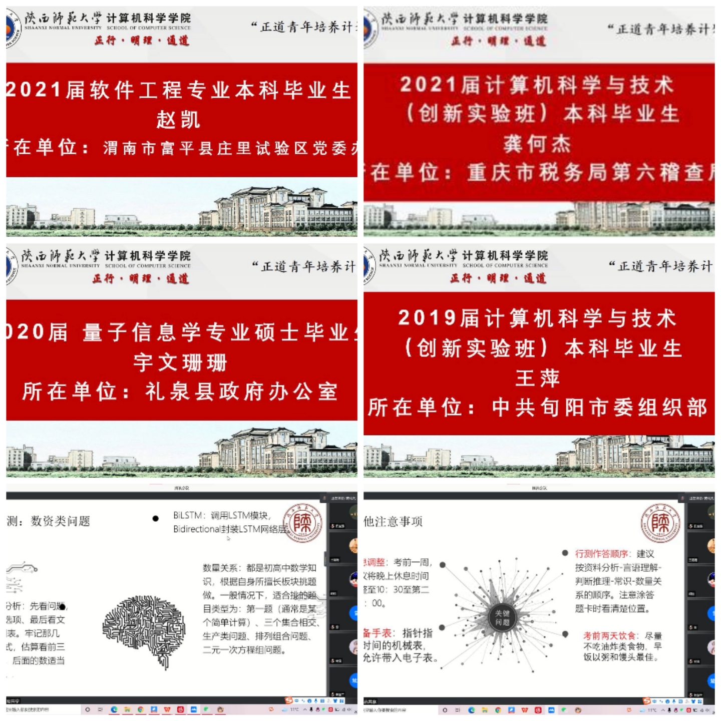 2020届硕士毕业生宇文珊珊就如何备考面试和报考辅导班的问题为同学们提供了意见建议;2019届本科毕业生王萍结合驻村工作经历分享了平时学习中需着重提升的能力素质;2021届本科毕业生龚何杰分享了自己备考公务员考试的时间节点、做题方法以及注意事项;2021届本科毕业生赵凯,结合自己备考经历介绍了面试技巧以及选调生职业发展相关问题。