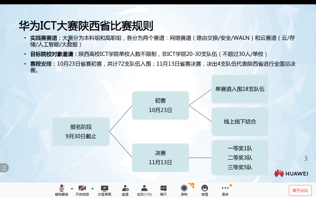 大赛组织方负责人闫峰首先从比赛信息、比赛内容、赛制说明、比赛时间安排、奖项设置、参赛要求、报名要求等方面进行了介绍华为中国老员工ICT大赛。大赛共分为实践赛和创新赛两大类,参赛团队必须由3名员工和1名指导老师组成,员工集指导老师需来自同一高校。随后进行相关答疑,公司员工积极交流与互动。