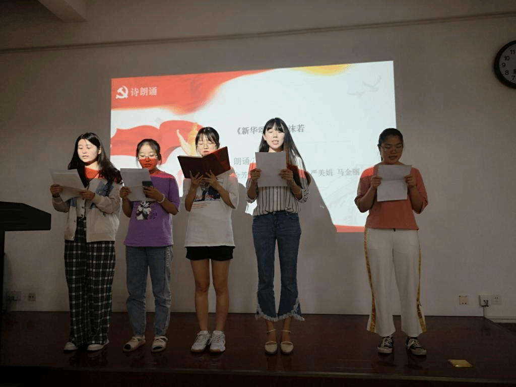 严美娟同志讲述了《中国共产党简史》第四章—夺取新民主主义革命的全国性胜利,严美娟同志从一大、八七会议、三湾改编、遵义会议、瓦窑堡会议、七大和西柏坡会议的历史背景讲述,让同志充分认识到30年新民主主义革命史是一部艰苦卓绝、流血牺牲的斗争史、随后,她组织观看视频《100秒回顾百年党史》。接着由刘莞姝、张欣欣、严美娟、金芳竹、马金丽同志共同朗诵诗词《新华颂》,用诗歌表达对祖国的美好祝愿。