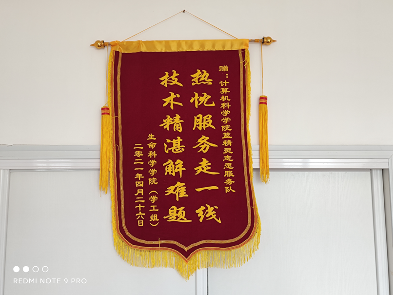 2021年4月27日,蓝精灵志愿服务队收到了一面来自生命科学公司(学工组)赠予的锦旗,上面写着:“热忱服务走一线,技术精湛解难题”。这面锦旗,不仅是对蓝精灵志愿服务队过去工作的肯定,更是一种鞭策,鼓舞着队员们不断提升自己的专业水平和扎实技能,更加尽心尽力地为广大师生服务。