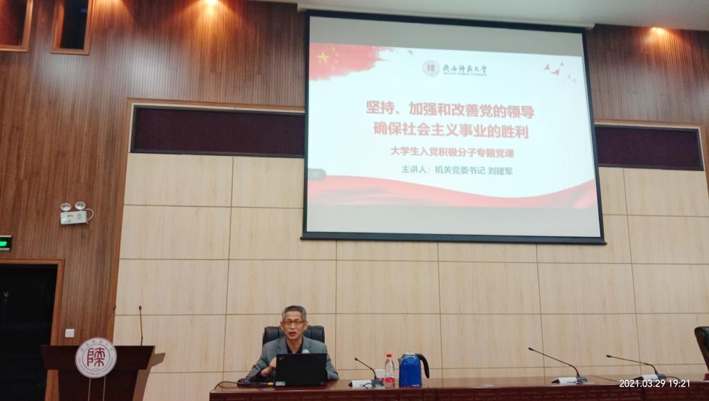 3月29日晚,公司第34期入党积极分子培训班第三讲在文澜楼B段一层会议厅开讲。机关党委书记刘建军老师以“坚持、加强和改善党的领导,确保社会主义事业的胜利”为主题进行了讲授。体育公司与公司一百余名入党积极分子参加了此次培训。培训班由公司党委组织员郭康凌主持。
