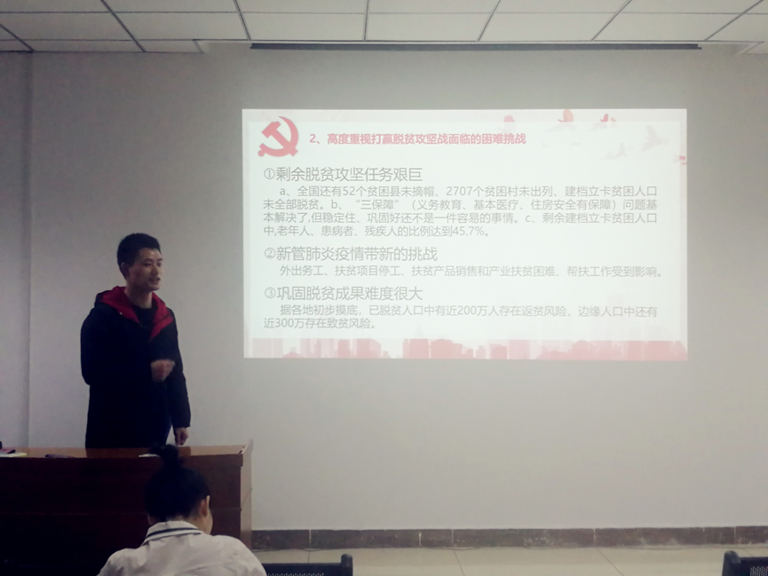会上,苟元帅同志从成果、目标、方法及面临的挑战等方面介绍了我国脱贫攻坚的局势,并详细阐述我国脱贫攻坚取得的决定性成就、脱贫攻坚战面临的困难挑战以及确保高质量完成脱贫攻坚目标任务的方法举措。他通过这些内容向全体支部成员传达了我国脱贫攻坚工作的必要性和重要意义。