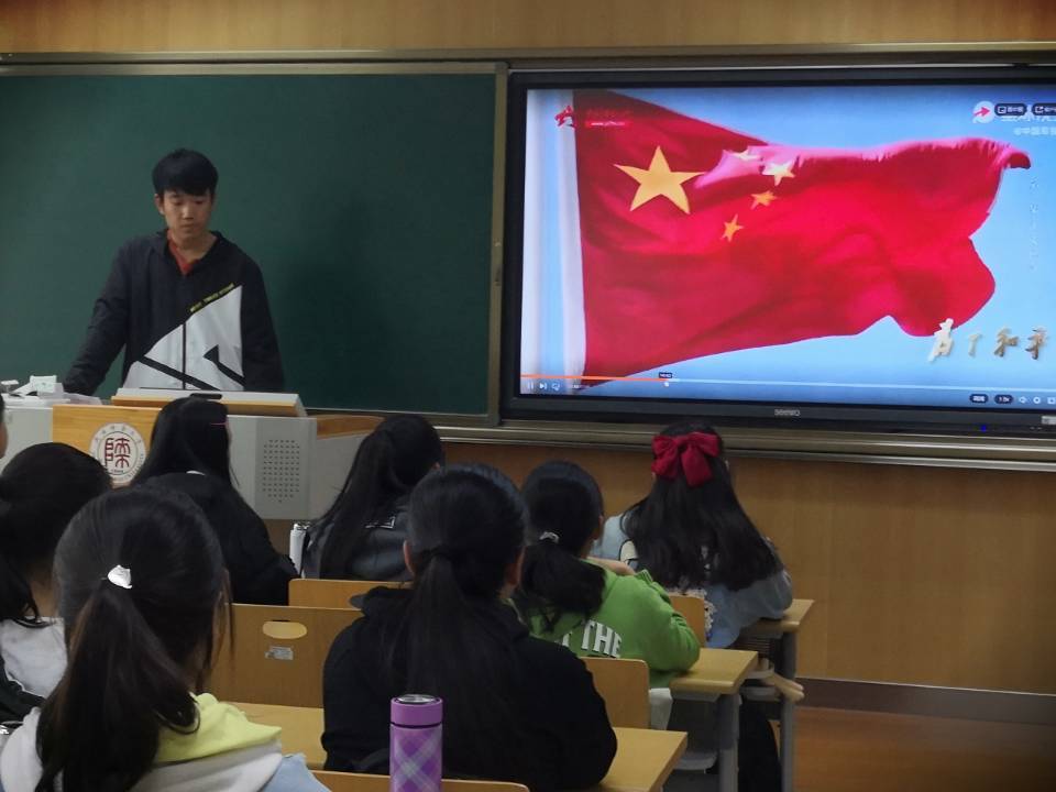 班会开始,逄铭杰向大家展示了一部关于抗美援朝的记录片,简要介绍了抗美援朝运动的历史背景,继而回顾了中国人民志愿者在朝鲜战场上的艰苦战斗与勇敢无畏。在观看过程中,同学们全面认识到抗美援朝对于保家卫国、维护世界和平的重要意义。