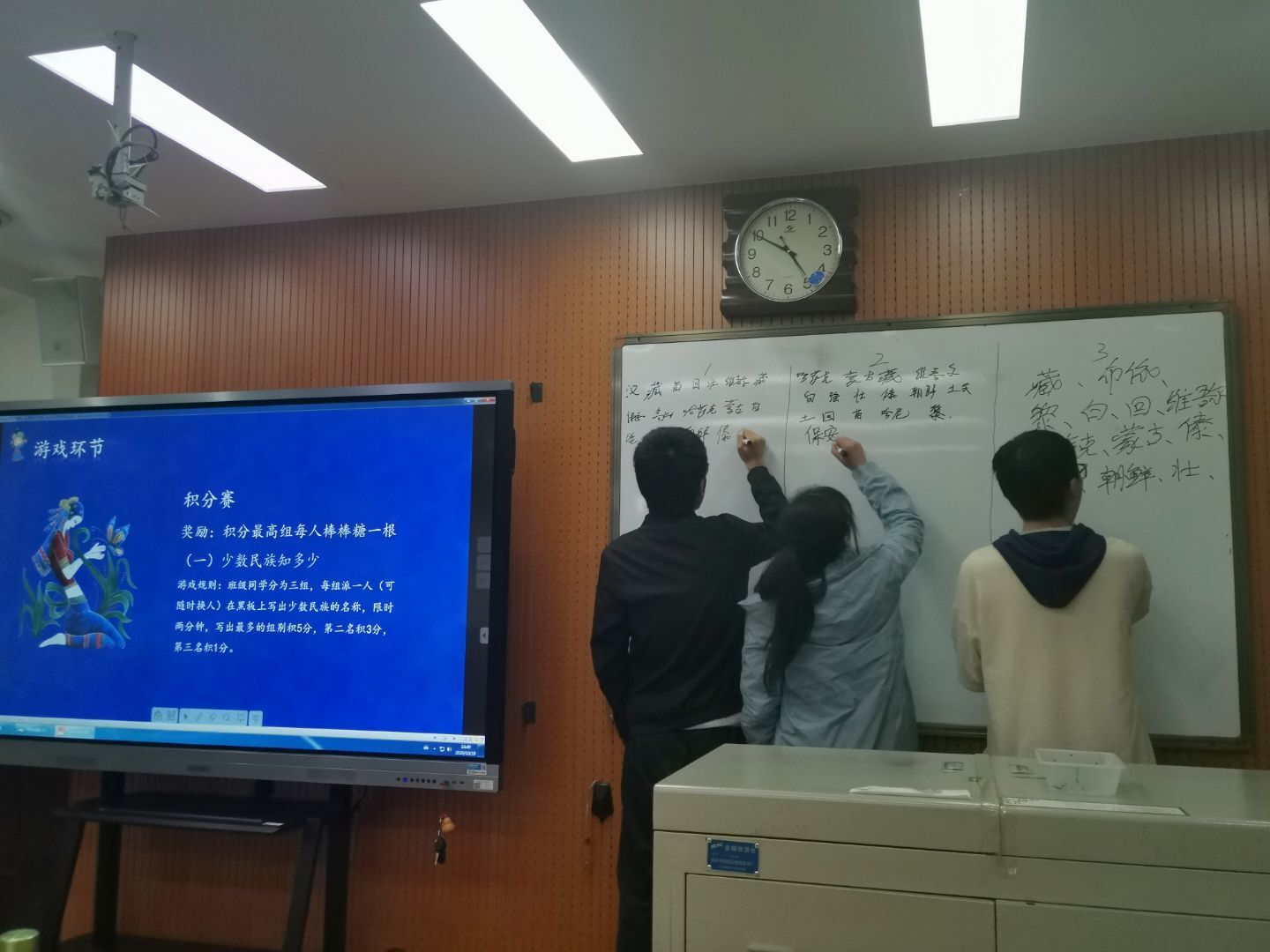 活动第三项,游戏环节“少数民族知多少”和“看图竞猜”将现场的气氛推向高潮。同学们分为三组,展开了激烈的限时积分赛。第一轮游戏,各组成员争先恐后上台写下少数民族的名称,还有场外热心同学的帮忙,不一会儿,白板上写满了同学们的成果。第二轮,鲜艳的服饰迅速吸引大家的眼球,抢答氛围积极活跃。通过轻松愉快的小游戏,同学们收获了许多有关少数民族服饰的知识,查漏补缺,活动在大家的欢声笑语中结束。