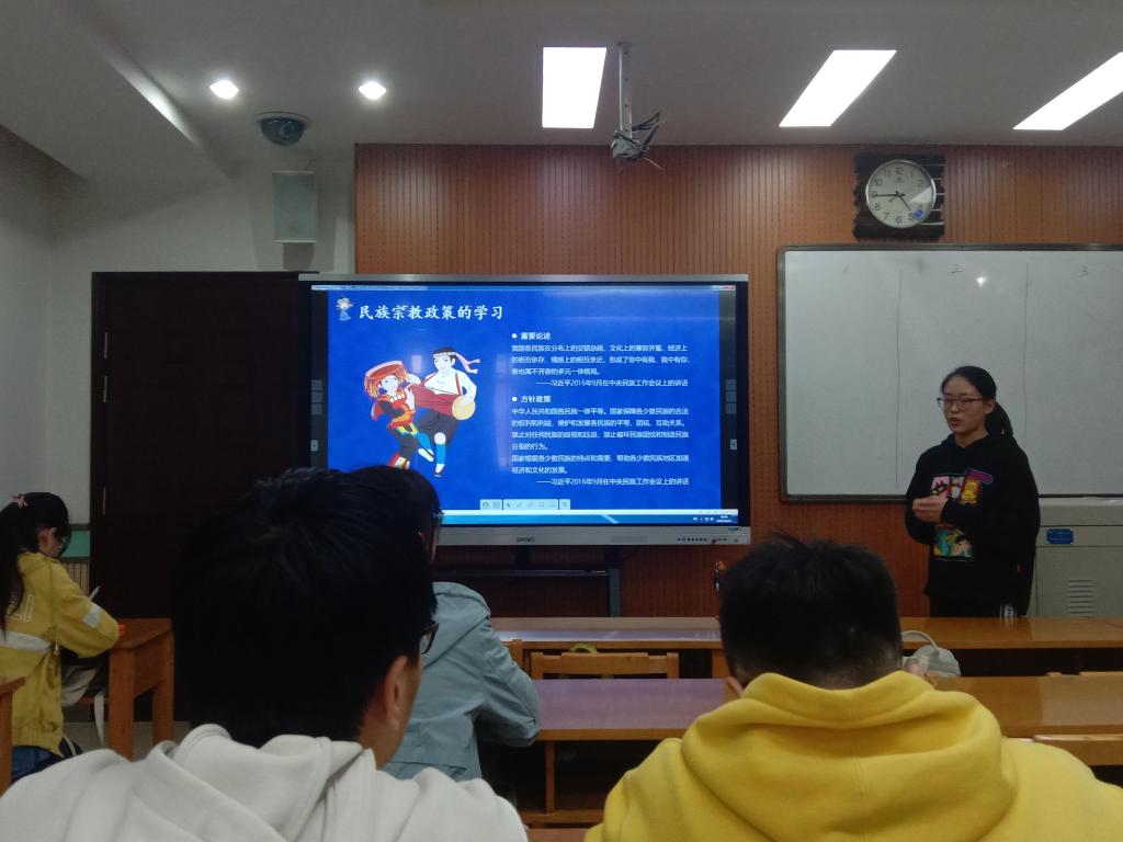 活动第二项,主持人对民族宗教知识及政策进行了详细介绍,使同学们更加正确地理解民族政策和宗教政策,也认识到中华民族是由多民族组成的伟大民族,你中有我,我中有你,石榴籽抱团谋发展,各民族团结共繁荣。接着主持人邀请班上9位少数民族同学分享独特的民族风俗习惯,传统节日等,使同学们更全面地了解少数民族。