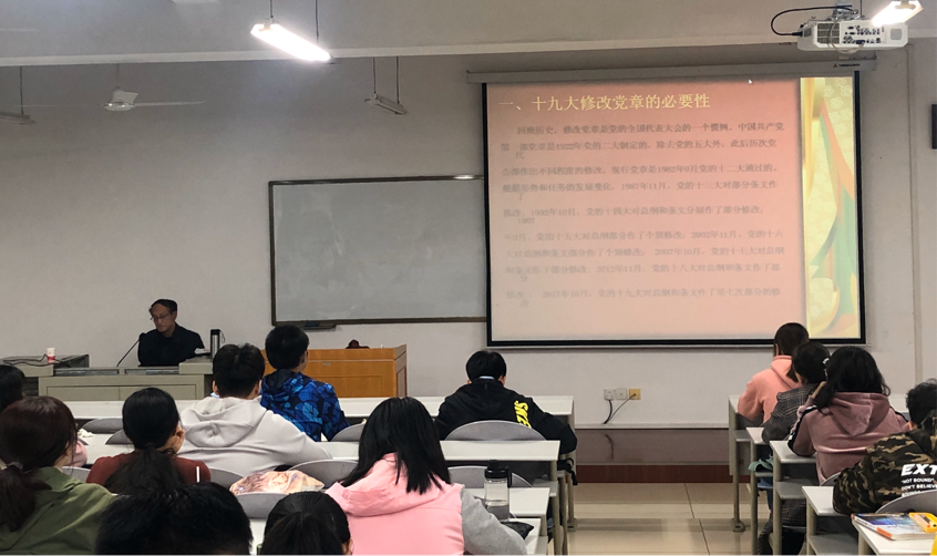 万保民老师分别从党章和党的性质两个方面进行了介绍。他通过讲解党章修改的过程向同学们明确十九大修改党章的必要性,并讲解了了修改党章的原则和主要特点,即坚持发扬党内民主,集中全党智慧。他谈到,新党章具有“新思想、四个自信、新目标、坚持以人民为中心、充实了加强党的建设的内容、坚持党对一切工作的领导”六大亮点,党章是党的总章程,是全党必须遵循的根本行为规范,认真学习党章、熟悉掌握党章是党员应尽的义务,各位入党积极分子也应认真学习党章。之后他着重介绍了党的性质,提出保持党的先锋队性质必须全面贯彻“三个代表”的重要思想,关建在坚持与时俱进,核心在保持党的先进性,本质在坚持执政为民,万老师还通过列举抗击疫情、一带一路等实例来说明中国共产党是中国特色社会主义事业的领导核心,是社会主义现代化建设取得胜利的根本保证,党的根本宗旨是全心全意为人民服务。