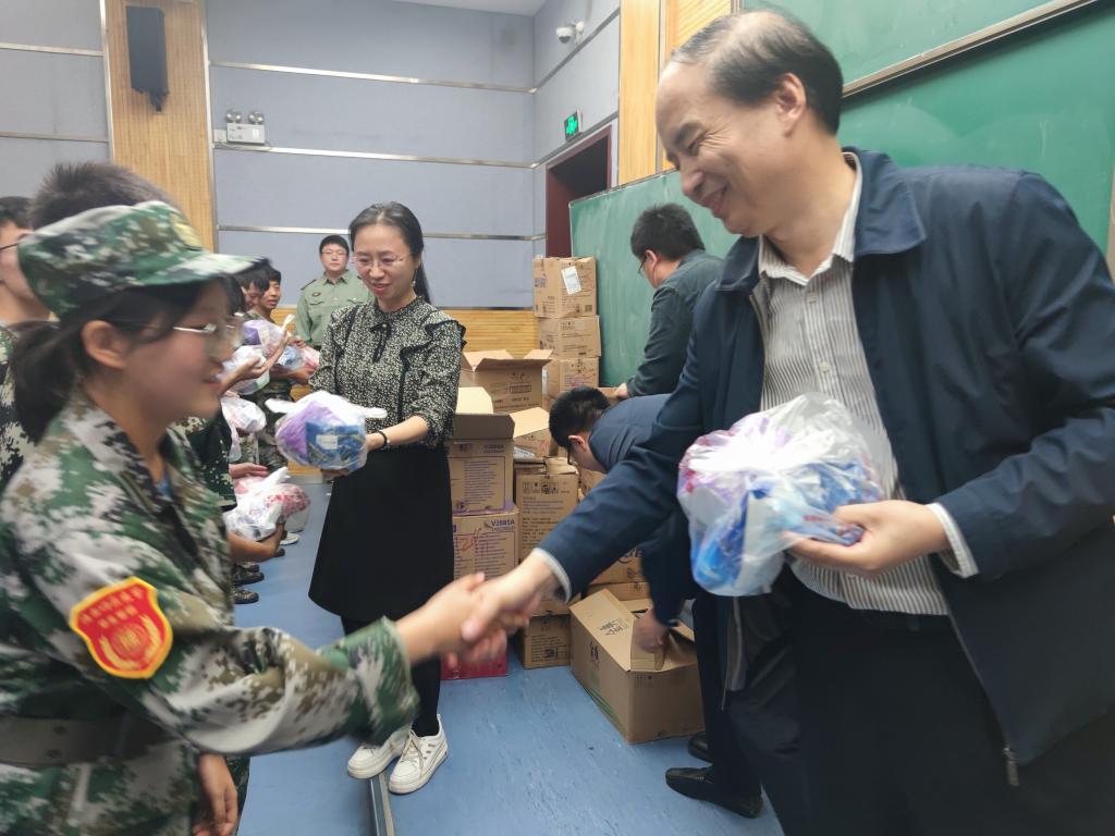 随后,黄书记和各位老师亲自将一份份爱心礼物送到同学们的手中。本次慰问舒缓了同学们紧张的训练生活,同时让同学们感受到了公司的关怀和温暖。相信在接下来的军事训练中,同学们会继续发扬不怕苦不怕累的精神,以顽强拼搏的意志上好大学的第一课。