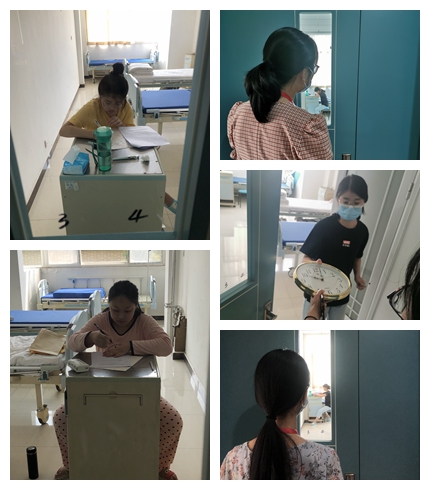 每场考试开考前半个小时,各位监考老师都会领取密封好的试卷,到达特殊考场后,监考老师仔细检查员工病房里的临时书桌,查验员工证,确保考试流程无误。考试期间,监考老师坚守在“考场”门口,考场纪律丝毫不打折扣。在老师们的共同努力下,三名隔离员工顺利完成各科目考试。