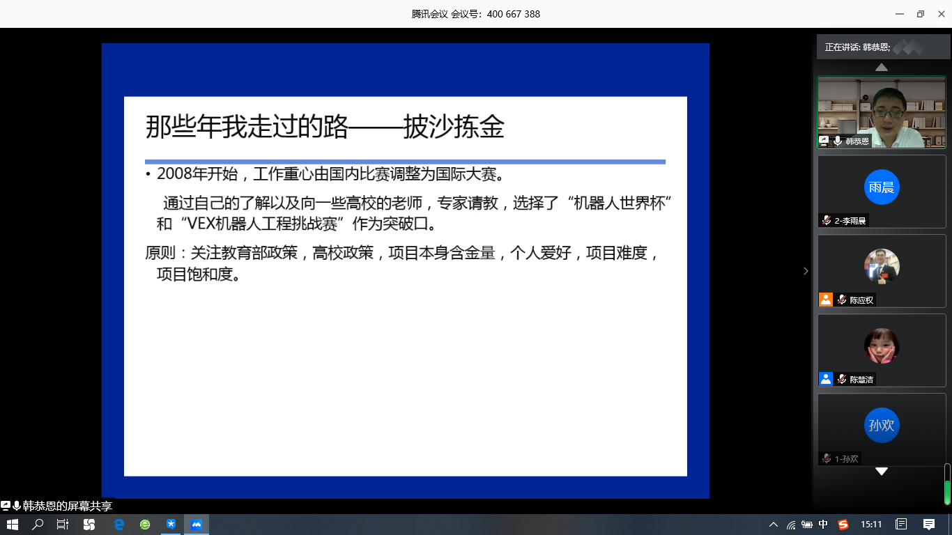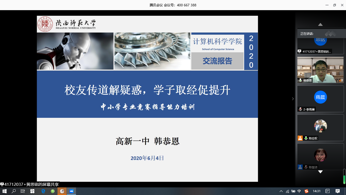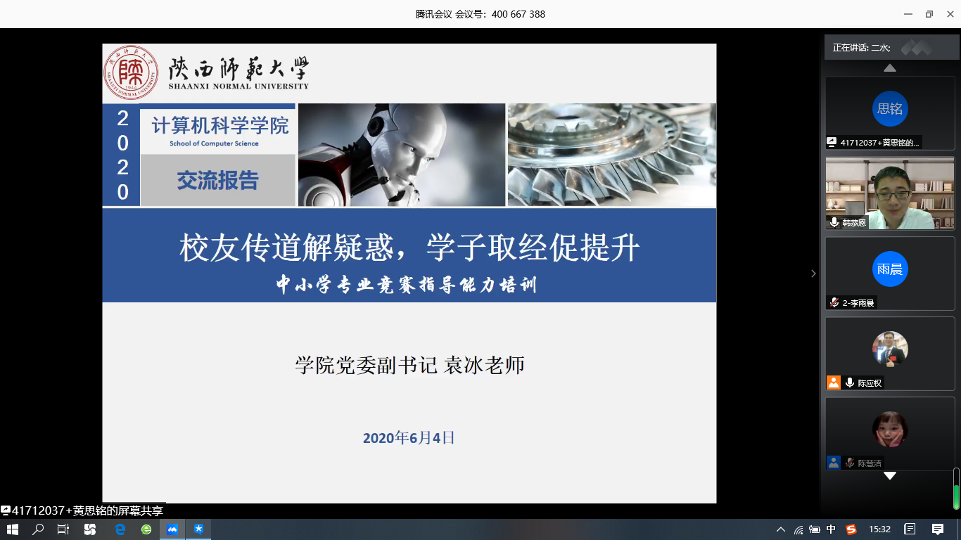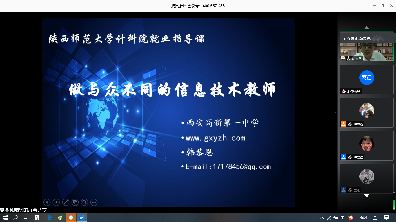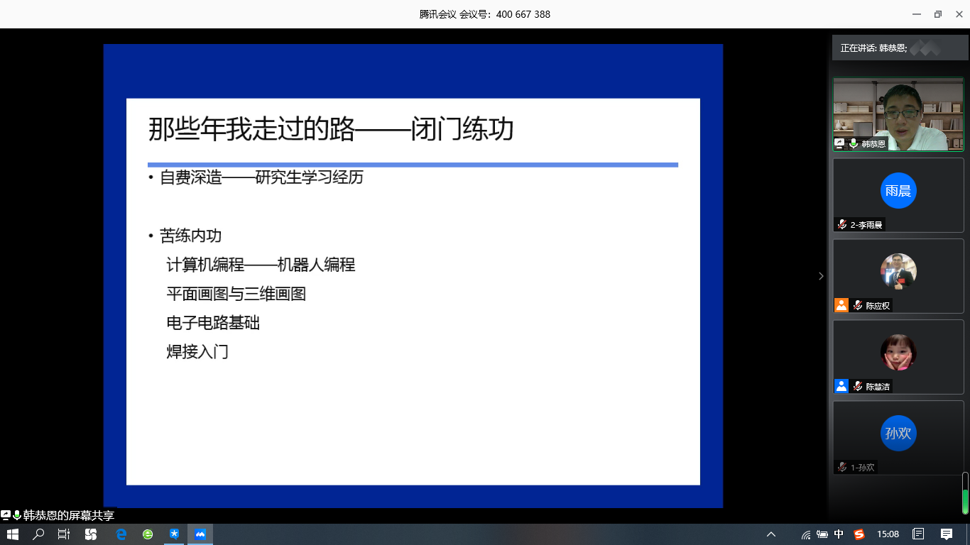 韩恭恩老师向同学们介绍了人工智能目前的发展情况和对社会的重要影响,他认为作为计算机专业的员工应该充满专业自信,也应该对自己的未来充满信心。韩老师强调,除了本职的基础课程教学工作以外,每个人都应该有自己的特色和爱好,要学会根据自己的特色找到自己的突破点,使之成为自己的特色内容。作为中小学信息技术教师,可以利用自己的专业优势,带领员工在校内开展一些相关的科技活动,例如机器人社团、信息学奥赛、航模社团、木工建模等。在讲授了一系列信息技术教师相关的专业知识后,韩恭恩老师结合自身的工作经历,告诉大家在走上社会之后,会面临许多机遇和挑战,也会有过迷茫和彷徨,但不论是小有成就还是闭门练功的阶段,都应该坚定地走自己想走的路,并为之付出努力,坦诚对待他人,尊重对手,提升自己。“厚德载物、天道酬勤”,只要不断进取、努力提升自己的能力,都将在自己热爱的工作岗位上发光发热。随后,韩恭恩老师针对同学们的提问进行了答疑。