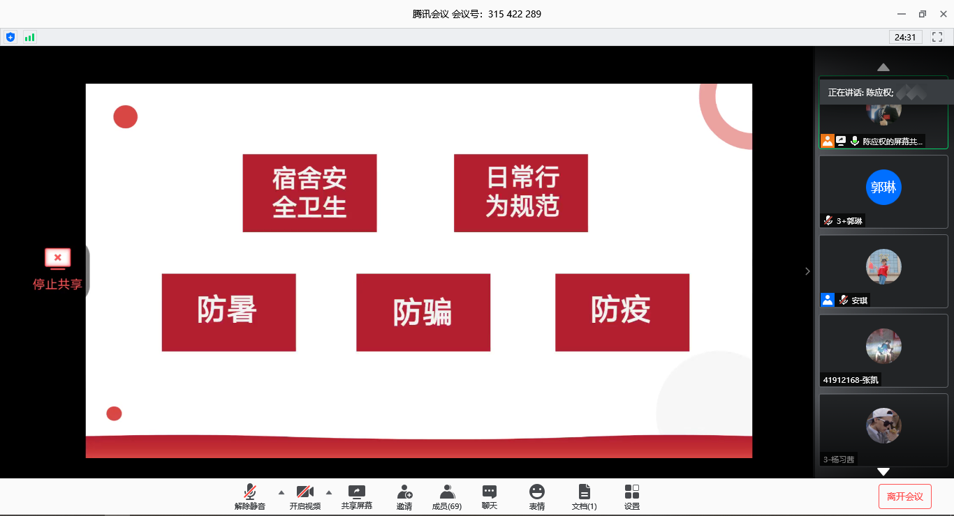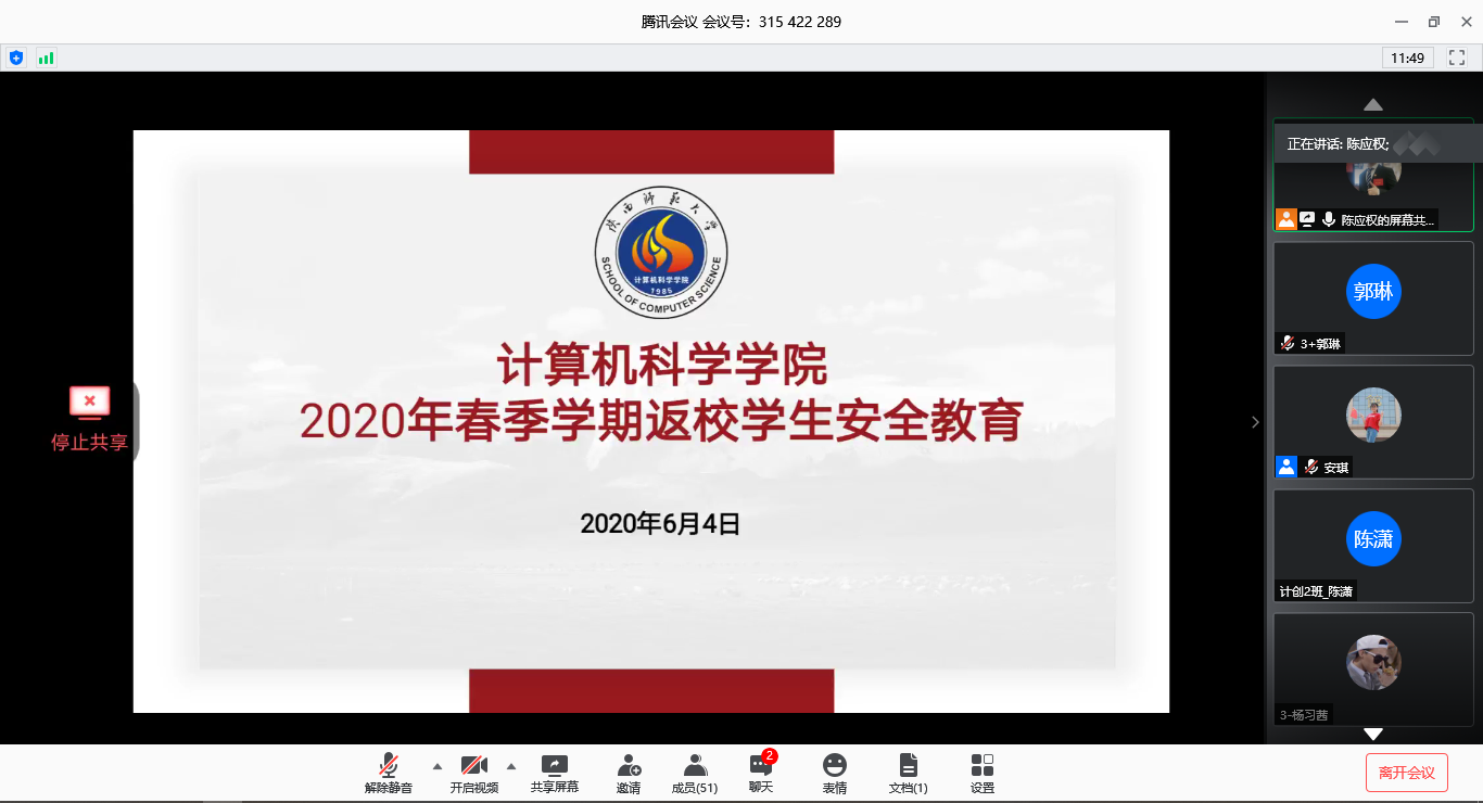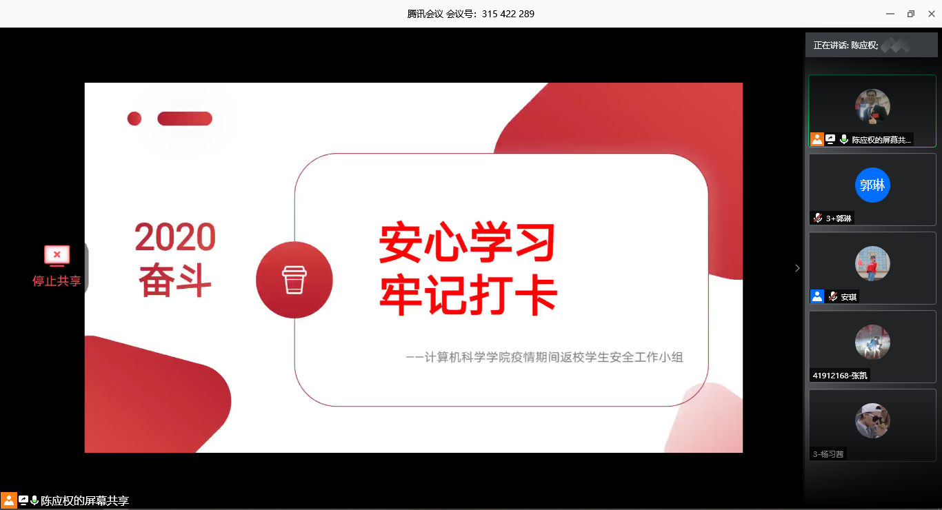 为加强疫情期间返校员工的安全管理、配合公司疫情防控工作要求和需要,6月4日12时许,公司通过腾讯会议举行了2020年春季学期返校员工线上安全教育。辅导员安琪、崔瑜璠以及公司2020年春季学期返校员工共计80余人参加了本次会议,会议由辅导员陈应权主持。