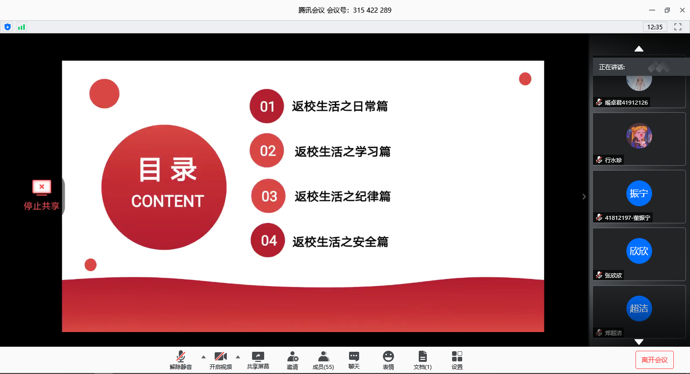 陈应权老师以返校员工日常生活的方方面面为切入点,就宿舍、食堂、浴室、教室、图书馆等与同学们息息相关的场所的管理规定进行了说明。此外,陈应权老师还就公司现在的封闭式管理、每日的三次上报体温以及异常情况的汇报进行了相关说明,并要求所有的返校员工都要能够真正理解并配合公司在疫情期间的相关规定,为公司疫情防控工作做贡献。