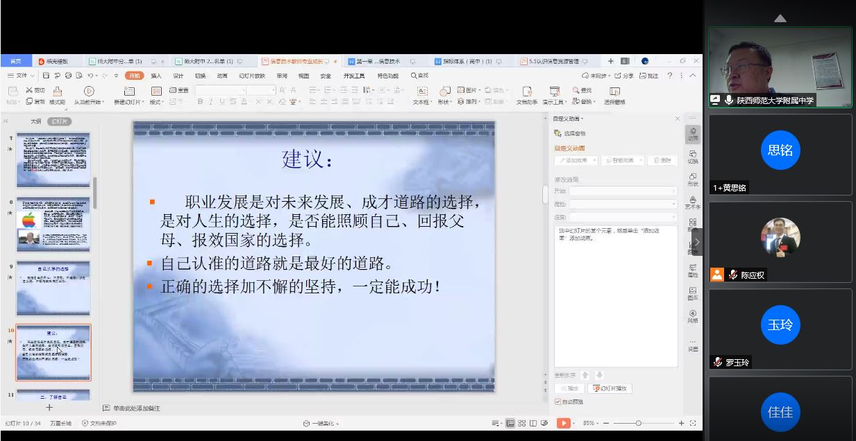 马立老师以一个博士生放弃出过留学机会选择担任中学数学教师的故事为例,告诉我们兴趣和感情对工作的重要性。接着又通过举例,告诉我们要学会均衡分配自己的时间和精力,依从自己的内心,不后悔不遗憾。随后马立老师通过实际授课示范,提醒大家信息技术教师必须要具备研究教学大纲能力,信息技术教学要跟进时代,而不是局限于教材,教学要源于教材而高于教材。