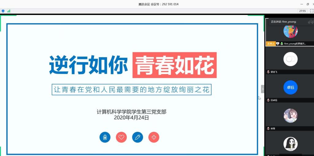 为加强支部建设,凝聚党员思想共识,进一步发挥党组织战斗堡垒作用和党员先锋模范作用,公司员工第三党支部于2020年4月24日通过腾讯会议召开“逆行如你 青春如花”主题党日活动。
