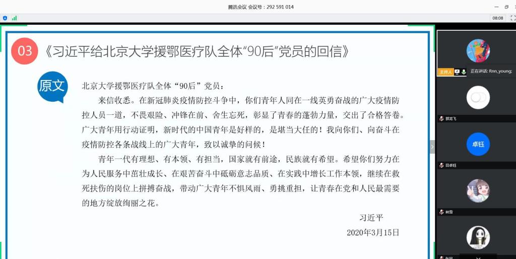 接下来,支部书记任仰对4月份支部理论学习内容进行了简单介绍,带领支部党员共同学习《习近平回信勉励北京大学援鄂医疗队全体“90后”党员 让青春在党和人民最需要的地方绽放绚丽之花》。通过一段视频,支部成员共同了解了北大援鄂医疗队的故事,既被他们的故事感动着,也被习近平总书记的回信勉励着。习近平总书记在短短三天内回信,既有肯定和赞美,也提出了要求,是对广大青年奋力夺取疫情防控和实现经济社会发展目标双胜利的极大鼓舞,也是对新时代中国青年树立远大理想、热爱伟大祖国、担当时代责任、炼就过硬本领、锤炼品德修为的谆谆教诲。