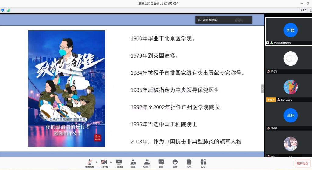 首先,由贾新磊同志带来了“抗疫英雄钟南山、张静静”的五分钟微党课,他从两位抗疫英雄的人生履历谈起,带领大家共同学习了二位的抗疫事迹。他谈到作为青年员工党员,要亮明身份积极发挥引领作用,从自身做起,为抗疫斗争做出积极贡献。