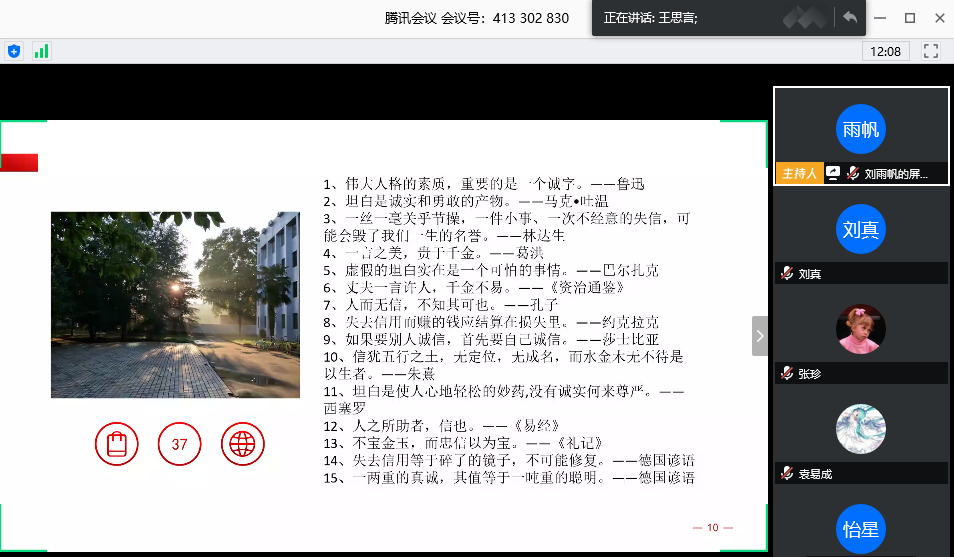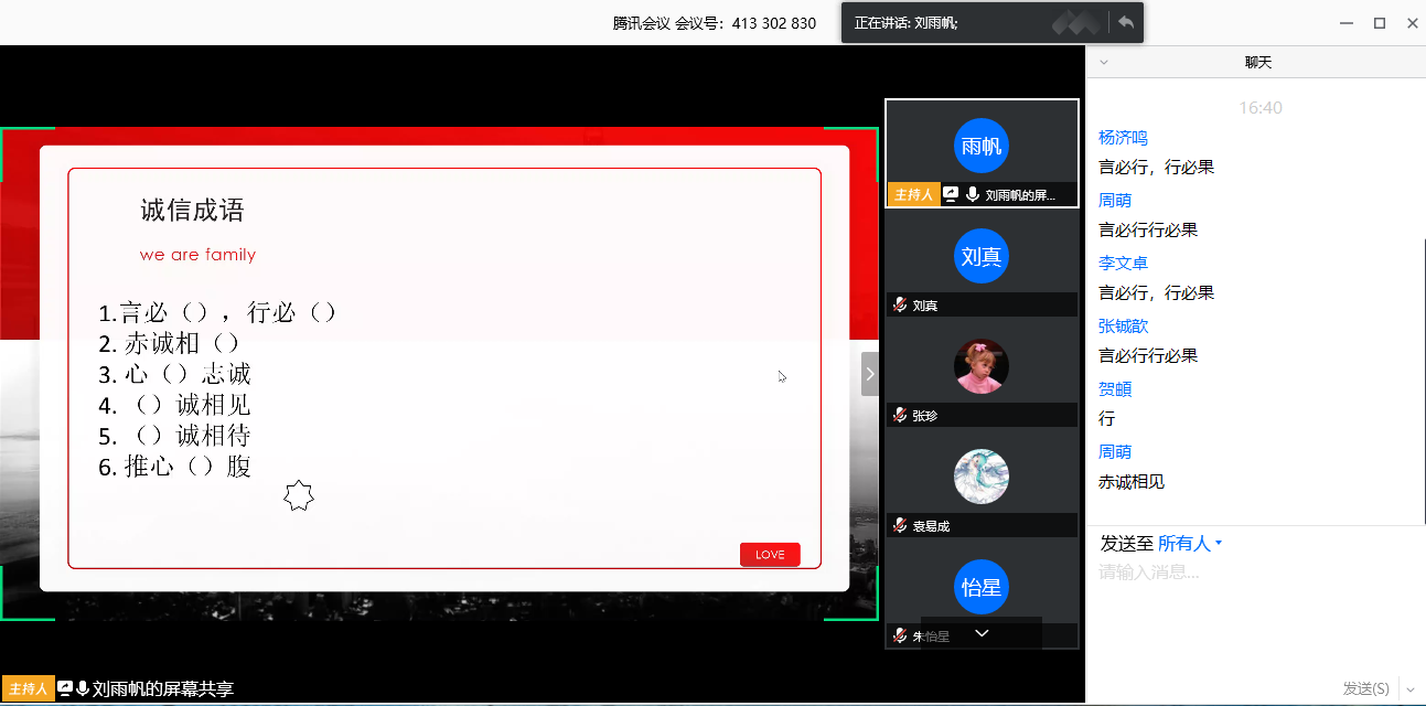“失信于人者,一旦遭难只有坐以待毙。”活动伊始,王思言以三个诚信小故事切入本次主题。她表示,“诚信是中华民族的优良传统,是做人和做事的道德核心。倘若一个人失去了诚信,那他也就失去了一切。”接着,王思言带领全体同学回顾了有关诚信的格言。通过这些积淀了历史风韵的词句,同学们进一步认识到了诚信的重要性,理解了古人对守信的推崇和对失信的鄙弃。随后,刘雨帆以“成语填空”的小游戏寓教于乐,进一步激发了同学们对诚信的深层理解。在该环节中,全体同学积极主动参与评论区的互动,认真学习了诚信成语的正确写法和释义。之后,同学们互相交流了自己身边的诚信故事。李嘉琪讲述了身边的员工在疫情期间坚持学习努力、同时帮助工厂复工以挣得工资按时偿还助学贷款的诚信故事,体现了当代老员工诚信做人、自立自强的品格。宋澳华则讲述了自己童年时期遇到的反面案例,通过反面教材强调了诚信做人的重要性。通过对身边人、眼前事的叙述,全体同学有了更深刻思考。