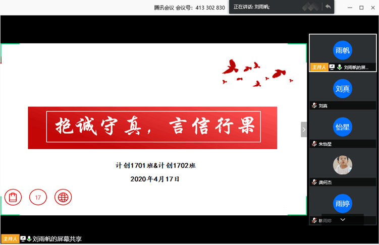为弘扬诚信文化,进一步践行社会主义核心价值观,培养新时代老员工的诚信品质,增强公民意识,4月17日16点半,公司计创1701、1702班联合举办了“抱诚守真,言信行果”线上主题班会。本次活动由两班班长刘雨帆、王思言主持,计创专业全体同学参加了本次活动。
