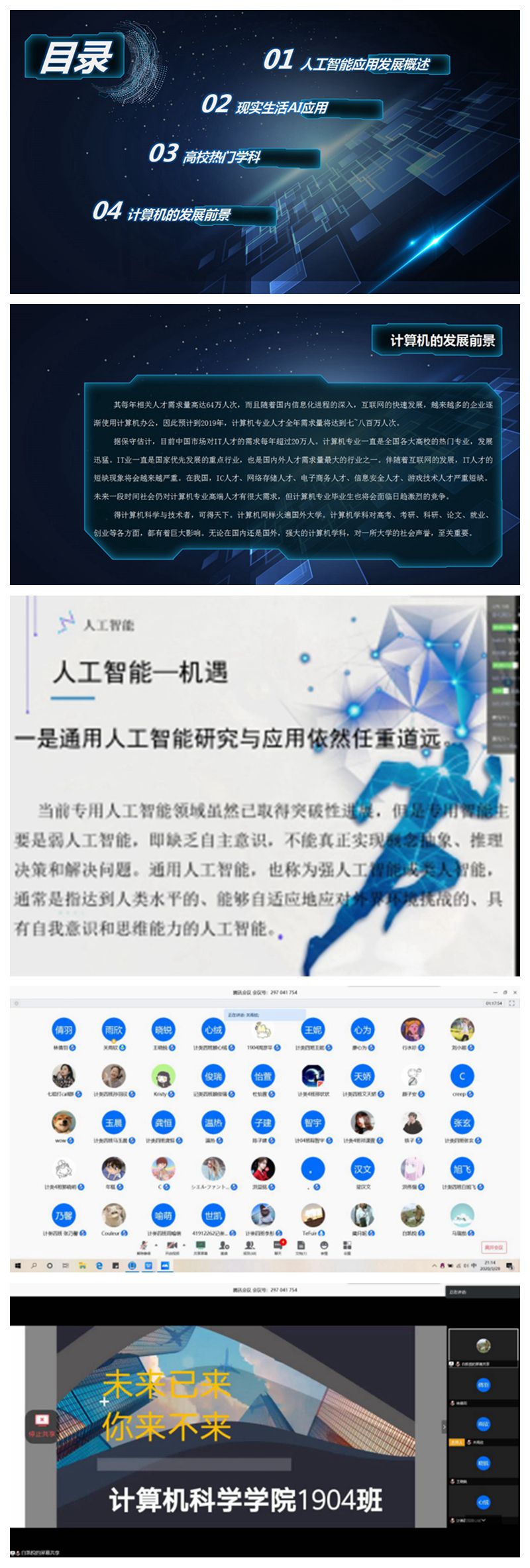 各班级班会形式多样,内容丰富。班委准备了精美的ppt和视频,通过视频播放的形式向同学们直观展示了人工智能的现状与未来发展方向,分别就AI技术的新特征、AI的认知计算、AI 3.0这三个方面展开介绍,通过多方位的视角介绍人工智能未来的前景。计科1901和计科1902班的同学纷纷表示,作为一名师范生,他们一定努力学好专业知识,未来走上讲台将计算机专业的魅力展现给更多的员工。计类班级的同学在班委的引导下,学习了《人工智能安全标准化白皮书(2019版)》等内容,同学们表示计算机专业未来有很大的前景。它将深刻影响甚至改变人们的生活方式,为生活带来极大的便捷,非常荣幸自己能成为这个专业的一员。