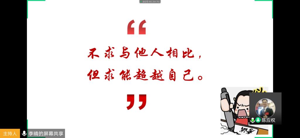 在班会的最后,辅导员陈应权老师强调了两点。一是受疫情影响,同学们目前都还滞留在家,一定要珍惜现在还有的学习时间,不要将大好学习时光浪费。二是受政策影响,咱们大部分同学本学期将是第一次参加教资考试,而且下学期就要参加教育实习,本学期是大家通过教资考试的最佳机会,一定要牢牢把握。