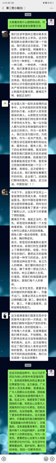 在听完“疫情防控思政大课”之后,员工第五支部迅速组织党员同志展开在线交流,通过群语音的方式谈一谈自己听课后的感想以及在此次疫情当中的真实感受。支部的每一个人都谈了自己的体会,从大家的发言中可以发现,大家感触最深的就是第四位教授讲的关于青年的责任担当与使命。